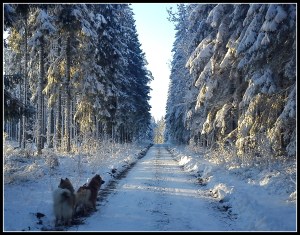 Nu är världen riktigt vit efter gårdagen hiskeliga snöande. Vi har nog fått minst 15 cm snö som har bäddat in landskapet. Det började snöa vid middagstid, stora flingor i mängder, och slutade inte förrän framåt kvällskanten. Vid midnatt gick strömmen som inte kom tillbaka förrän vid halv åtta i morse och bredbandet var också dött men hade vaknat till liv nu när jag kom hem efter hundträningen i Rolfstorp.