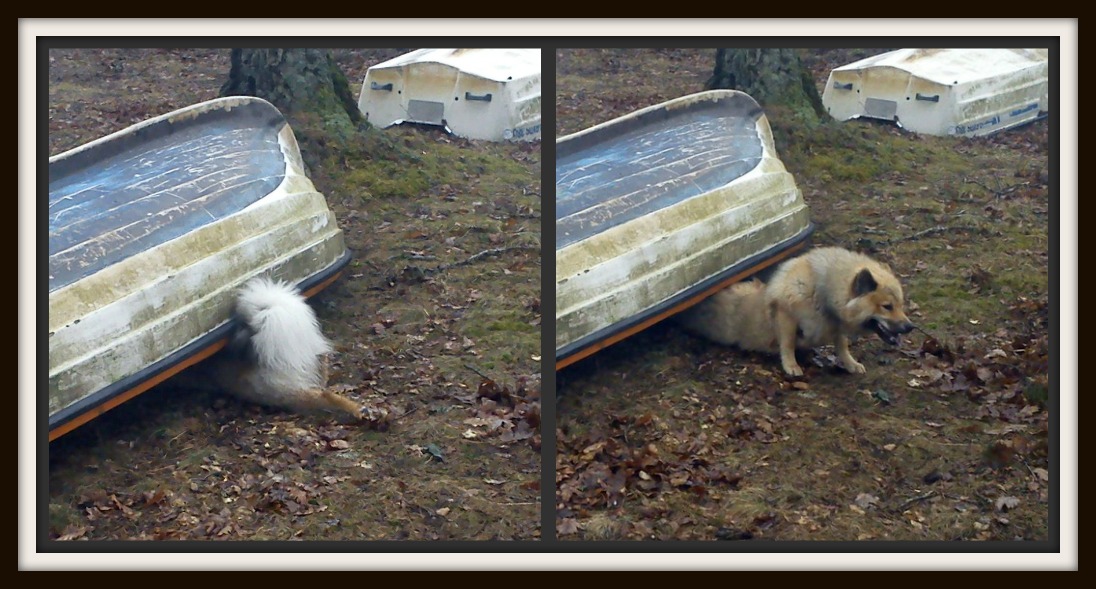 Något som Tindra tycker är mycket spännande är upp och nedvända båtar. Hon ska ofta in under dom och kolla läget. Zelda brukar hålla sig utanför och hålla koll istället 😉