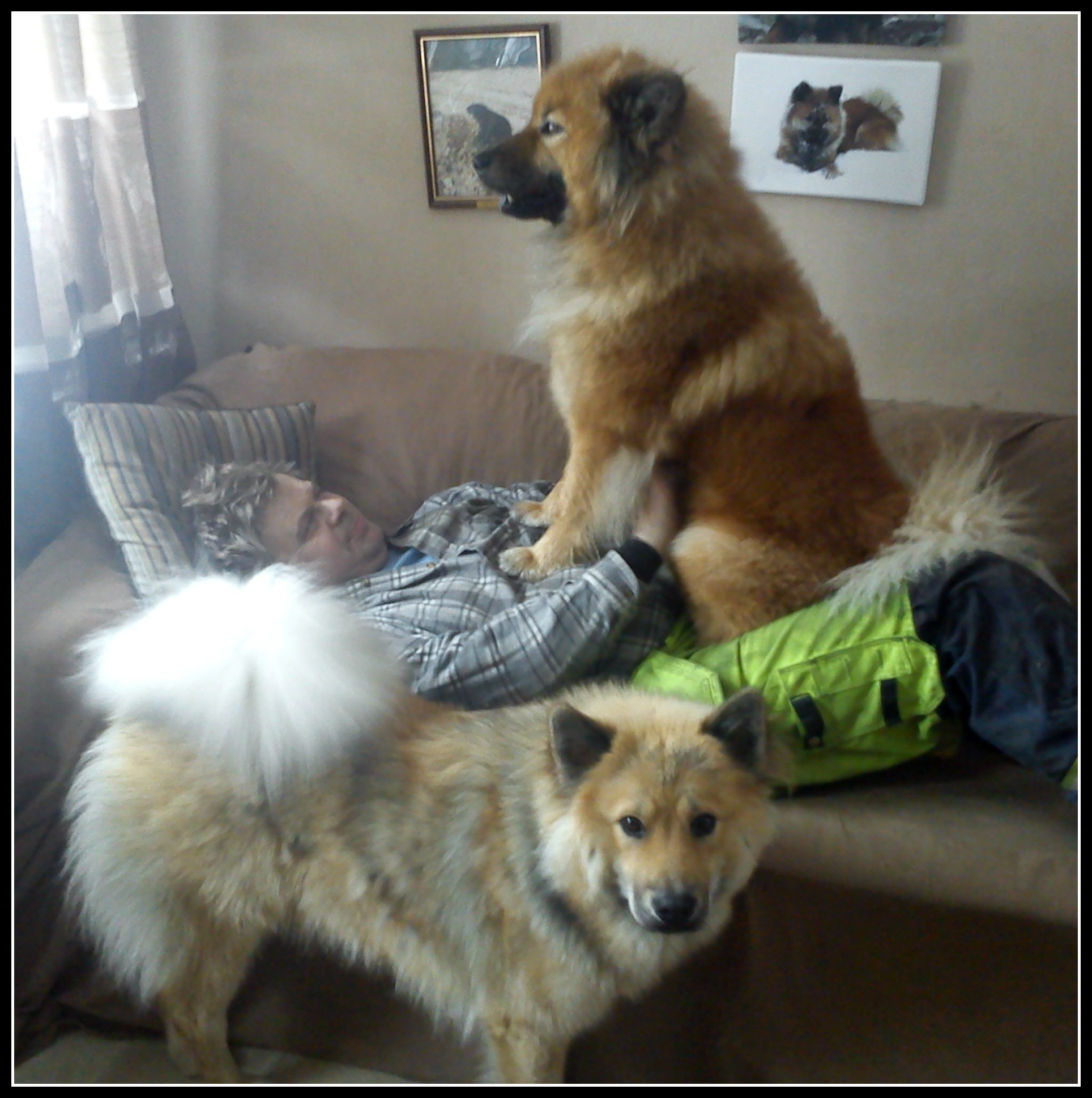 Zelda tycker att varför gosa på ett vanligt sätt när man kan sitta mjukt och bekvämt på husse istället ;). Tindra ser allt lite undrande ut :).