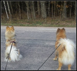 Att en liten söt ekorre kan vara så fantastisk rolig…. ja det är inte minsann alltid man förstår sig på sina hundar :). Efter att länge och väl stirrat ut ekorren kunde vi fortsätta vår kvällspromenad i relativt lugn om man bortser från ett och annat jättehopp av tjejerna ner i diket i förhoppningen om att fånga en mus ;). En vana som jag inte alltid uppskattar, speciellt inte när jag inte är beredd för då kan ni nog räkna ut själva vad som kan hända…….. 😉