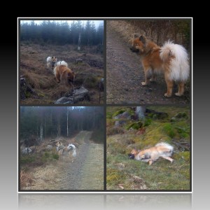 Ja idag blev det en rejäl runda i skogen ovanför vårat hus med tjejerna. Precis när vi hade kommit ut så började det såklart regna och jag hade ingen keps på mig….. Inte så kul att gå då men det vara bara att gilla läget med regnet rinnade på glasögonen ;). Som tur var blev det uppehåll efter ungefär en halvtimma och då blev det riktigt skönt ute :). Det märktes att på tjejerna att vi gick en rejäl runda igår med för de var inte riktigt så stolliga som de brukar 😉