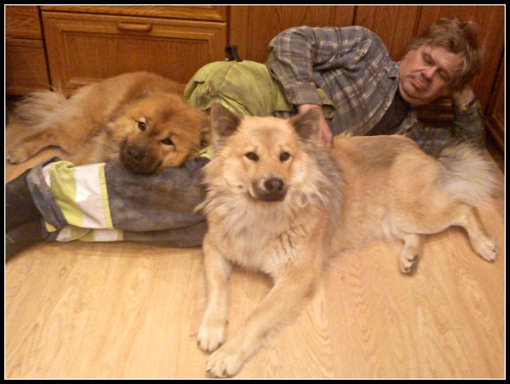 Ja igår kväll var lyckan stor hos tjejerna (och även hos mig) när husse äntligen kom hem. Då sätter minsann konkurrensen in när dom försöker lägga beslag på honom själva när han som vanligt lägger sig på köksgolvet för lite mys. Det sägs ju att hundar inte kan vara avundsjuka men denna bilden säger nåt annat….. 😉