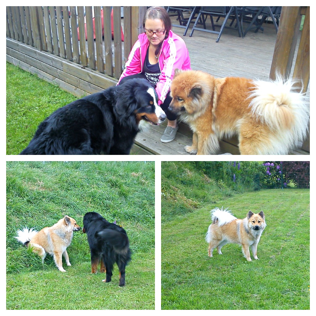 Nu har tjejerna fint herrbesök här i form av en stilig Berner Sennen hane vid namn Atlas. Det är min syster Marias hund och våran uppfödning. Såklart har han matte och lillhusse med sig :). Igår hade hundarna fullt upp med varandra vilket ledde till att de sov väldigt gott inatt 🙂