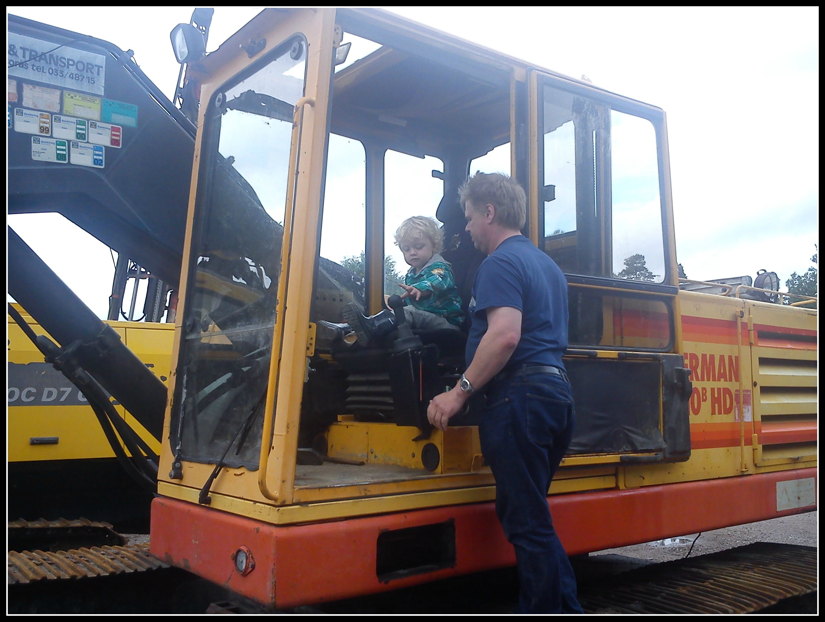 Så var det lördag igen som förgylldes av mysigt sällskap. Dagen började såklart med frukost och sedan gjorde Hasse Noahs dag med en titt samt provkörning av alla maskiner som stod nere på verkstaden. Lastbil, grävmaskin samt borrvagnar. Tror ni Noah var nöjd eller? 🙂