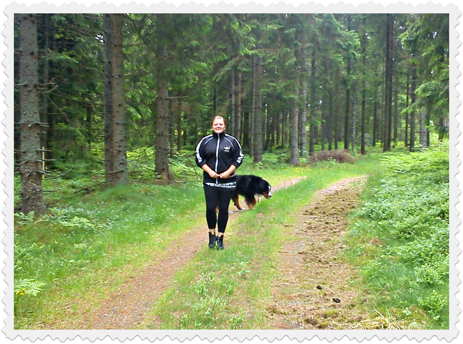 Efter detta blev det en fika innan vi gick ut på en skogpromenad med hundarna. Tur med vädret hade vi med, solen sken så vackert under hela promenaden. Det enda som störde idyllen var enligt min syster alla otäcka myror. Och det ultimata sättet att inte få dom på sig är tydligen att hoppa på stället :). Suck…….detta storstadsbarn 😉