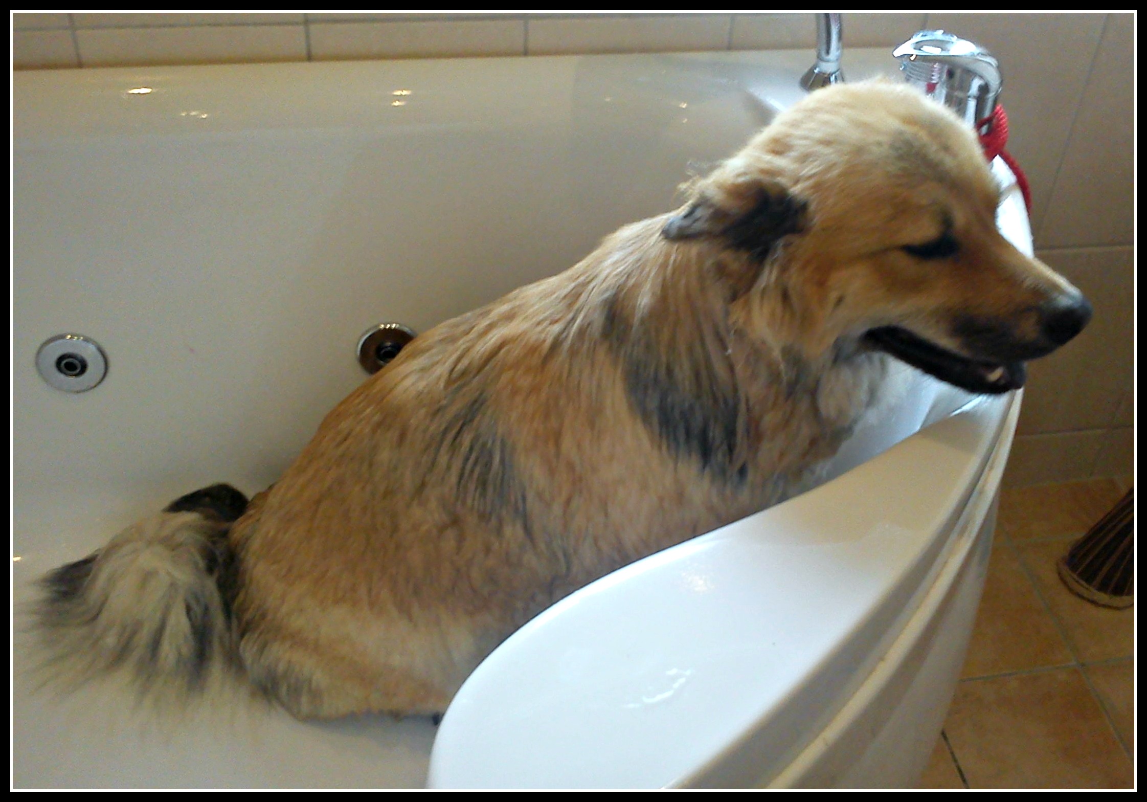 Hihi, ni skulle varit med här innan. Det räckte med att jag tog undan badrumsmattan för att Tindra skulle fatta vad som var i görningen :). Helt plötsligt var hon bara borta och kom såklart inte när jag ropade. Till slut hittade jag henne på andra våning bakom fåtöljen där hon satt och tryckte. Allt för att slippa badet inför utställningen imorgon :). Men det hjälpte minsann inte och här sitter hon i badkaret och surar 🙂