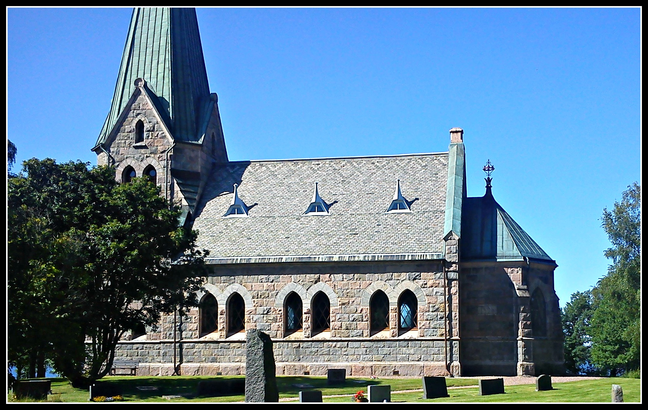 Efter fikan åkte vi vidare till Småland och Sandviks kyrka. En jättefin kyrka vid Fegensjöns strand som också är mycket populär att gifta sig i för att sedan ro över sjön till Backa loge och ha bröllopsfesten där 🙂