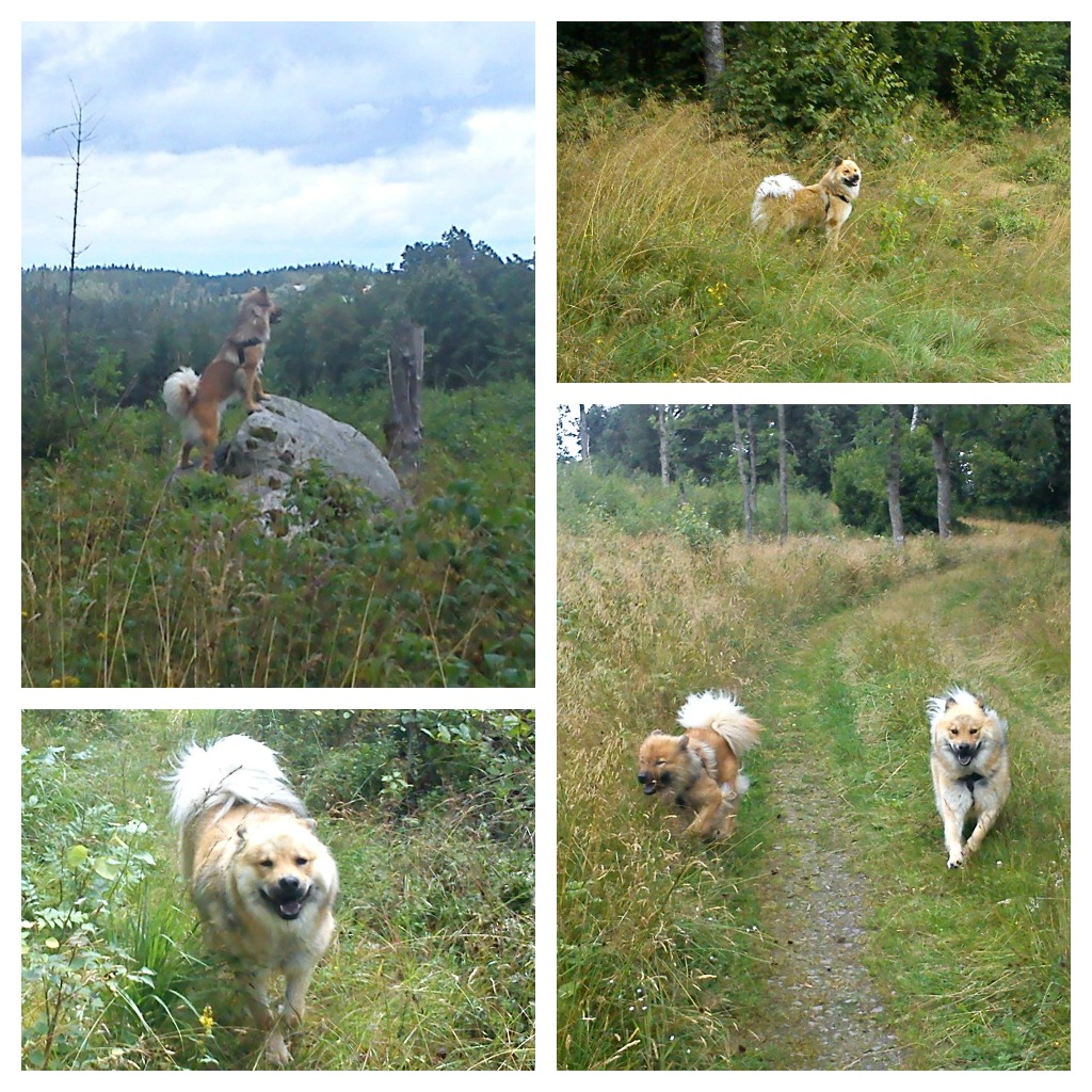 Japp!! Precis som rubriken säger så klarade vi oss ifrån regn under promenaden trots att det riktigt hängde i luften :). Vi gick en runda på cirka 6 km i både skog, på grusväg och i vatten. Måste ju säga att även om balansen inte är den bästa så gick det vägen även denna gång och jag undvek att ramla i den översvämmade bäcken. Men hundarna undrade nog vad jag höll på med där jag stod balanserade på en stock och troligtvis lät lite konstigt med 😉 . Tjejerna hade i allafall jättekul och sprang omkring och undersökte allt och lite till 🙂