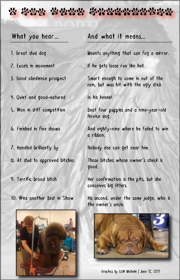 Det kan ju inte bara vara jag som har bekymmer med att tyda utställningsengelskan från domare och för att inte tala om att förstå kritiken man får. Döm om min lättnad när jag hittade denna på nätet. Nu behöver jag inte längre undra vad de menar 😉