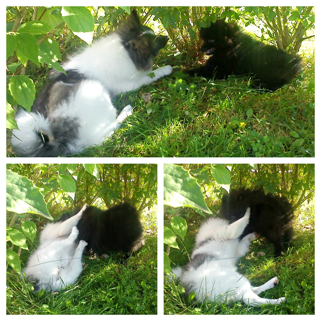 Tjejerna var såklart med och fick busa en stund med Nala & Simba. Fast ska sanningen fram så blev det inte så himla mycket bus då tjejerna hade minst sagt fullt upp med alla spännande dofter i trädgården. Till slut såg det ut som de hade svalt en träningssko med skosnörena hängande utanför, så mycket dreglade dom 😉