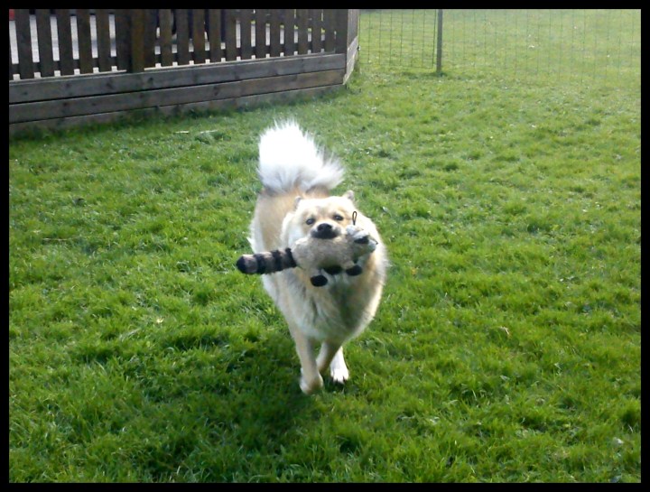 När vi kom hem så fick jag faktiskt klippt gräsmattan och sen blev det lite lek med lilla energiknippet. För närvarande är tvättbjörnen tillsammans med igelkotten allra roligast 🙂