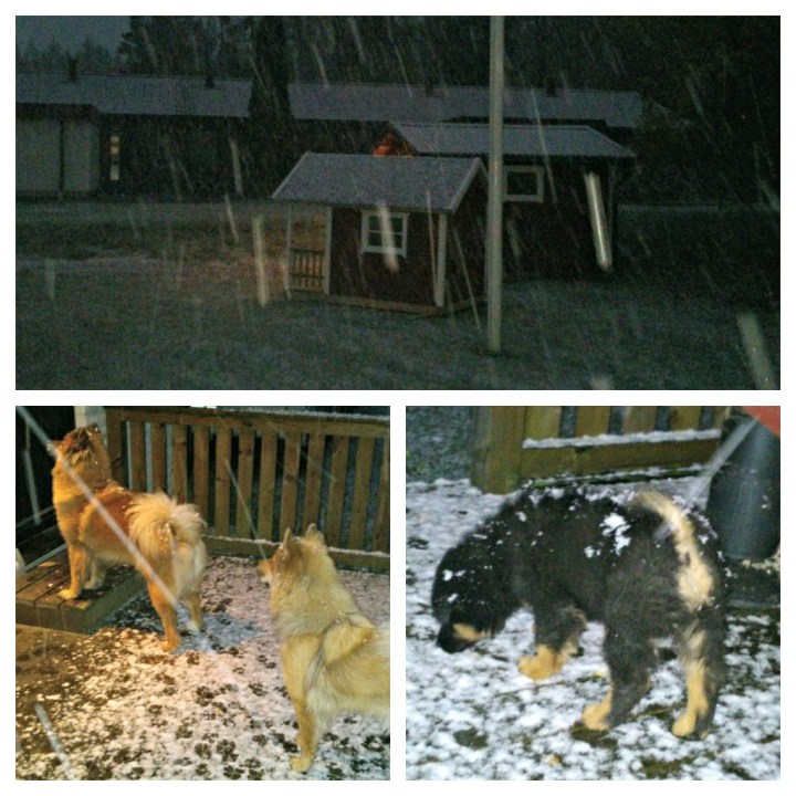 Zelda & Tindra tyckte det var mysigt med snö men när de hörde husses bil så stod dom på rad för att komma in medan Jill att fullt upp med att undersöka vad allt detta vita var för något? 🙂