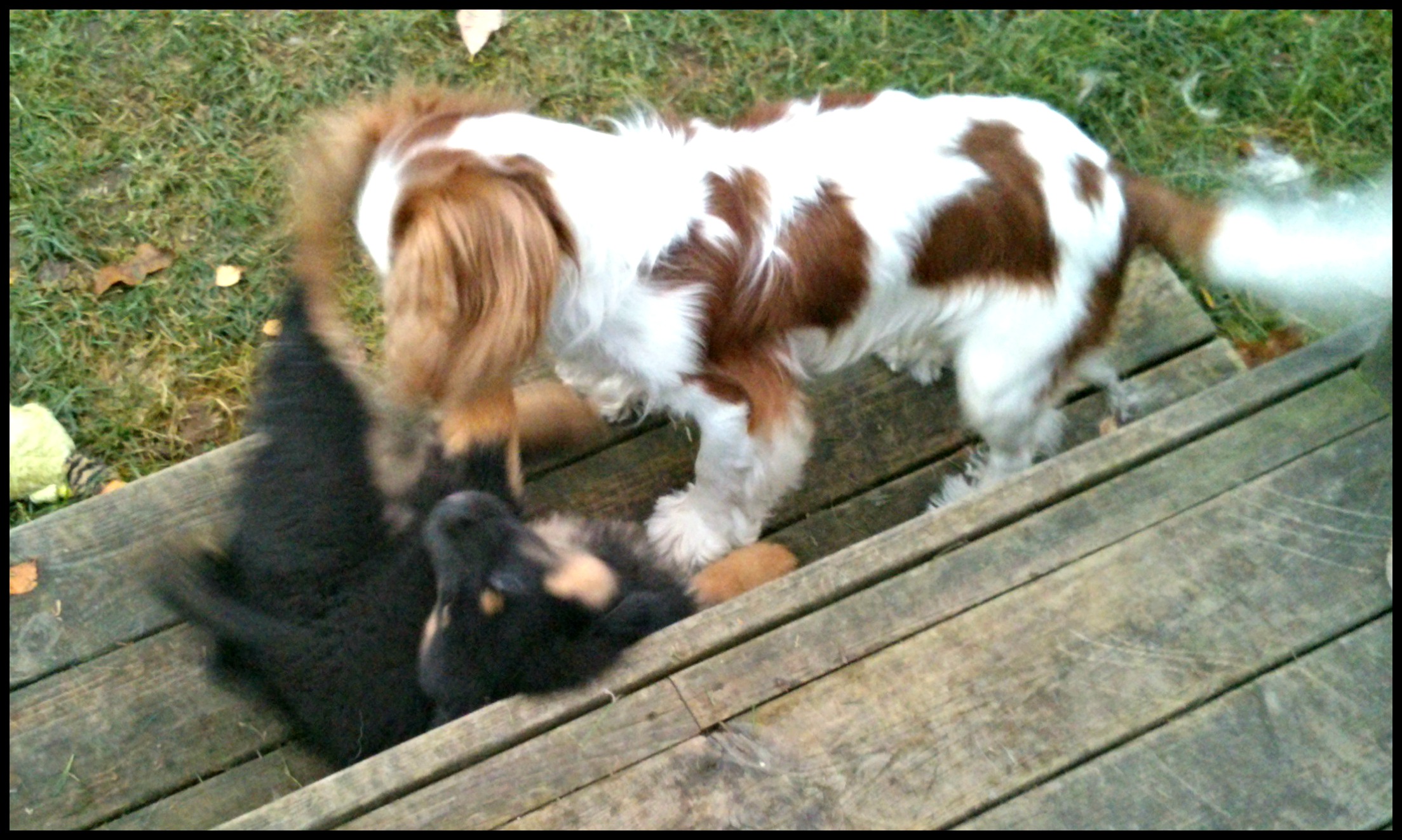 Idag har jag och Brollis kommit hem på besök. Mest bara för att vi ska bli matade med mammas tacos, och Brolle får festa loss på lite gott färskfoder. Men sen självklart för att träffa det nya tillskottet till familjen. Lilla söta Jill. Hon är ju alldeles supersöt, och hade inte Hasse vaktat henne med sitt liv så hade jag nog redan packat ner henne i handväskan och tagit med henne hem. Brolle blev väldigt förtjust i denna lilla dam och det tog inte lång tid innan han började uppvakta henne. Fast i min åsikt kanske denna uppvaktningen skedde på lite fel sätt… Om ni har hanhundar (eller män, haha 😉 hemma så kan ni nog räkna ut själva vilken sorts uppvaktning jag pratar om. Även om det skiljer 6,5 år mellan Brolle och Jill så verkar denna kärlek vara definitiv. Men den lilla damen är ändå bra med att säga till, så hon löser det hela väldigt bra ändå.