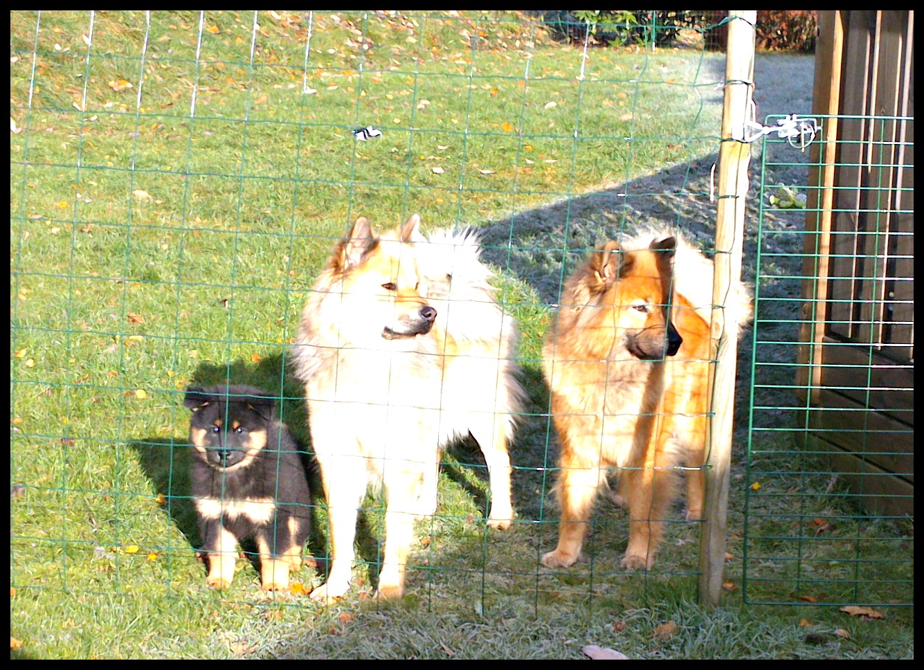 Kan ni tänka er? Idag när husse och matte grejade med våran hundkoja så fick vi minsann inte vara med!! Att dom bara har mage att utesluta oss på detta vis. Tydligen var det prat om att vi kunde vara i vägen, vad tror dom om oss egentligen? Vi som är så smarta skulle väl aldrig kunna vara till besvär, istället kunde vi ju hjälpt till. Men vi blev minsann förvisade till att vara på denna sidan staketet, stackars oss…. 😉