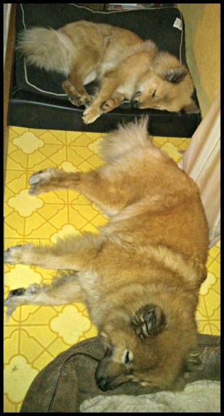 Vill även passa på att dela med mig av denna sköna bild jag tog i smyg på de stora tjejerna sent igår kväll. Tala om total avkoppling där de ligger bredvid min säng. Tindras sovstil är ju bara för skön medan Zelda använder den andra hundsängen som kudde :). Jill är också där fast hon syns inte eftersom hon envisas med att ligga under våran säng. Vi får väl se hur länge till det går, hon växer ju rätt fort ;).