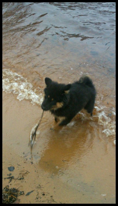 Idag började vi dagen med en tur till stranden innan vi skulle vidare till veterinären. Eftersom jag inte riktigt visste när vi skulle komma hem igen så tänkte jag att det var lika bra att passa på och få hundarnas rastning gjord :). Vi var där i cirka 1 timme och Jill börjar visa samma tendenser som Tindra har när det gäller vatten. Kolla bara här när hon stolt lyckats hämta en pinne i vattnet :).