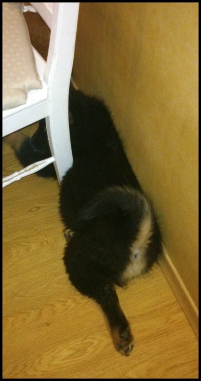 Jag upphör aldrig att förvånas över tjejernas minst sagt udda sovstilar. Man kan ju tycka när det finns både soffa & hundsäng så borde det vara betydligt skönare än ligga intryckt mellan väggen och stolen. Men vad vet jag? Jag är ju bara en människa ;).