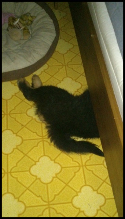 Och varför använda någon av de tre mjuka hundbäddarna när det finns ett hårt golv att ligga på, och då gärna med halva kroppen under sängen 😉
