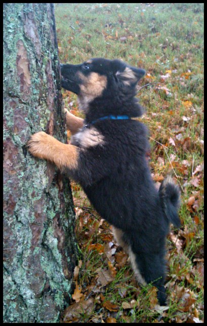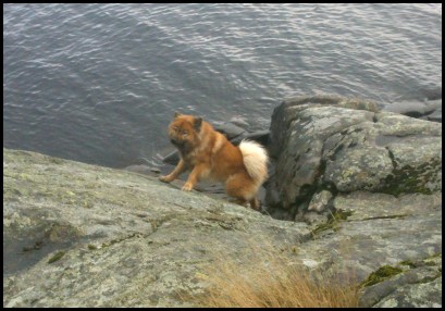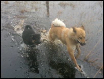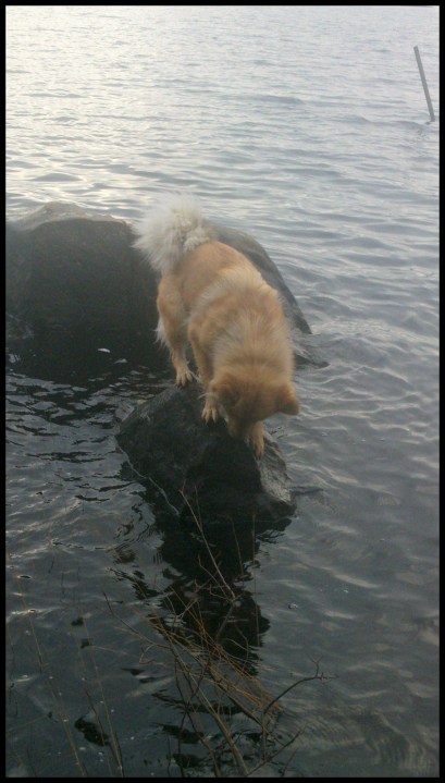 Hittade ni henne? När jag såg bilden första gången här på datorn så undrade jag för mig själv vad jag egentligen hade tagit kort på. Men vid en närmare titt så hittade jag allt lilla Jill väl kamouflerad vid stenen :). Som ni ser så tar hon efter Tindra när det gäller det här med vatten. Att ”äta” vatten samt att sticka ner halva huvudet och blåsa bubblor är senaste grejen :). Sen är det ju också väldigt kul att springa i vattnet 🙂