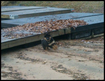 Bryggan är väldigt spännande, speciellt att krypa in under den. Men när matte kallar så kommer Jill ändå med en rivstart 🙂