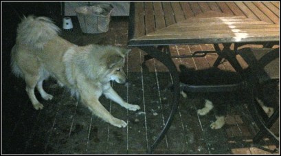 Jill fick sig några riktiga frispel i snön och sladdade omkring på altanen med Tindra hack i häl och bjöd mig på några gap-skratt, tala om Bambi på hal is ;). Mellan varven pausades det för att äta snö från stolarna som tydligen är en riktig höjdare 😉