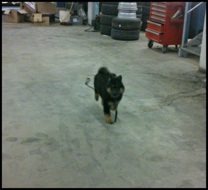 Innan vi åkte hem så tog vi vägen om verkstaden för ett litet ärende. Såklart fick lilla Jill följa med in och den miljön verkar då inte bekomma henne det allra minsta utan hon gav sig glatt iväg på lite egna äventyr men var snabbt tillbaka för att hålla koll på sin matte 🙂
