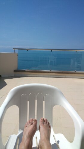 Framåt eftermiddagen var vi hemma vid hotellet och njöt ett par timmar på terrassen innan vi tog gratis-taxin ner till grannbyn för middag med denna utsikt 🙂