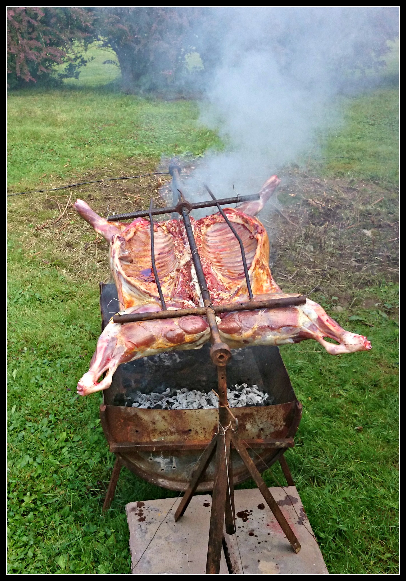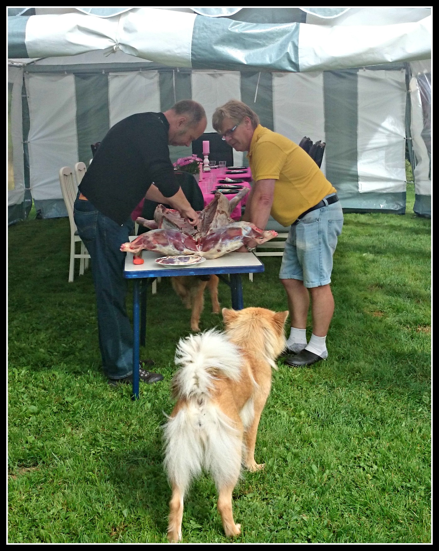 Ja nu är vi i full fart med alla förberedelser inför kvällens grisfest och först ut var såklart att fixa till det ”lilla” svinet med fyrbenta åskådare på båda sidor 😉