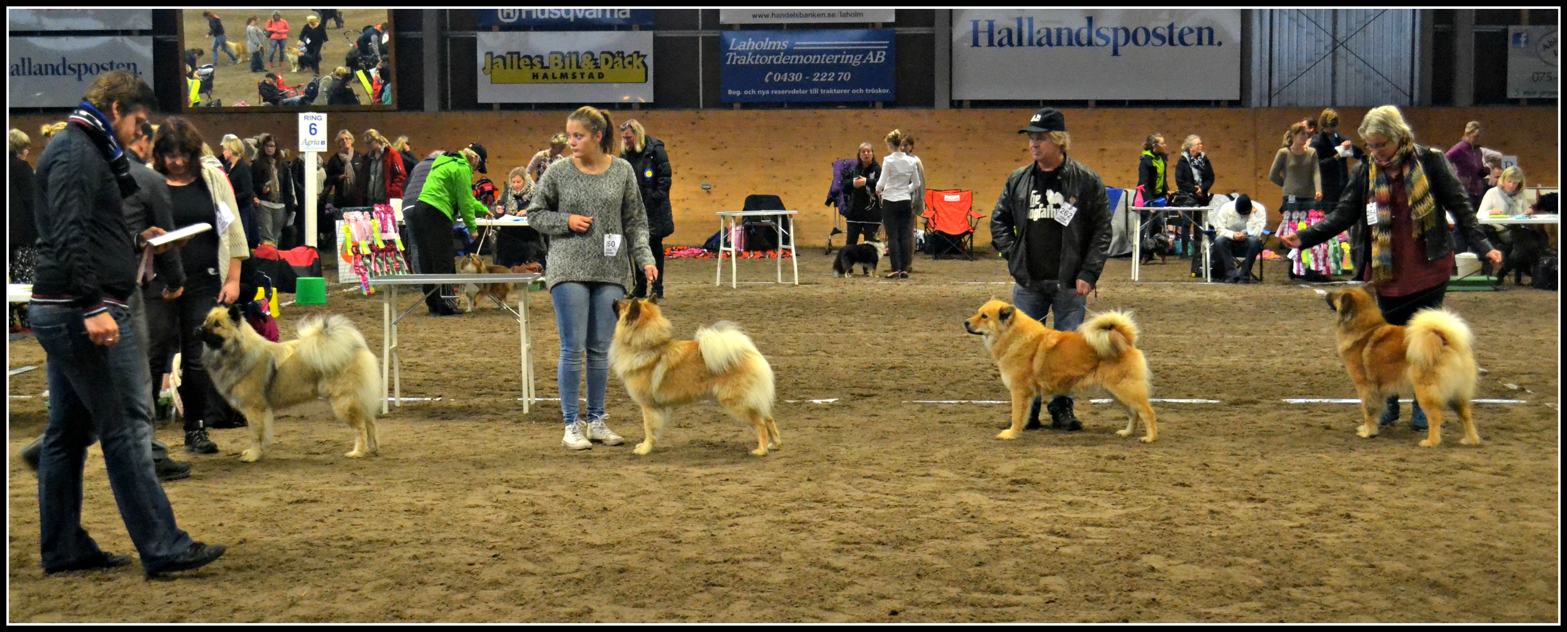 Då är man äntligen hemkommen, har redigerat foton och NU pustar jag ut här vid köksbordet efter en fantastisk dag i Laholm :D. Det var ett regnigt men varmt, hela + 15 grader, Laholm som mötte oss vid halv nio-tiden imorse och väl på plats så träffade vi resterande 3 eurasier som skulle vara med och det var alla tikar. Så fördelningen med våra tjejer blev som följer; en i valpklass, 2 i unghund, 2 i öppen samt 1 i championklass :).