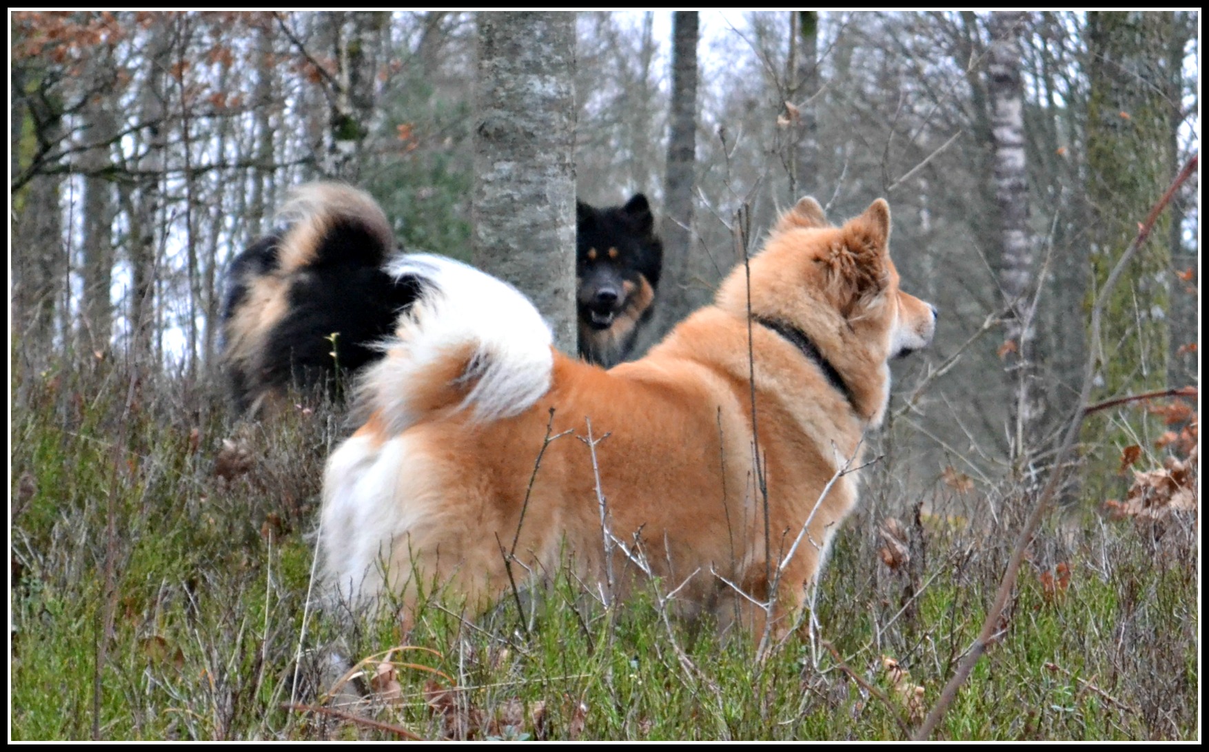 Nästa tillfälle yppade sig rätt snart då jag och Tindra stod så vackert och spanade mot horisonten ända tills matte tryckte på avtryckaren, då passade jag på att smita bakom trädet samt vinkla huvudet lite lätt och där sket sig mattes motiv igen 😉 😀
