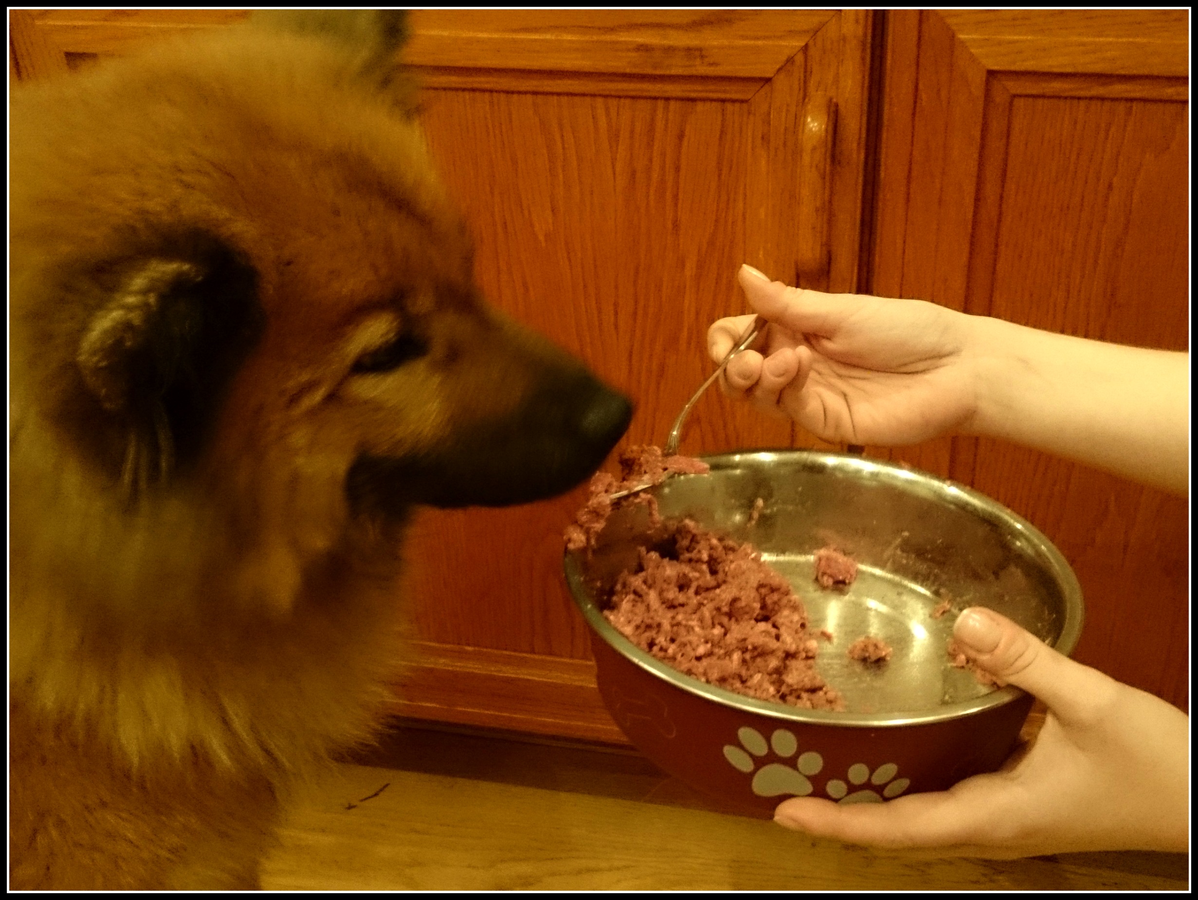 Suck… ja som ni ser så handlar det om handmatning av Zelda där dottern matar på gaffel, något mer civiliserat än jag som kör helt och hållet naturellt. Vilket betyder exakt vad ni tror, alltså helt utan några som helst andra redskap, ja med fingrarna då med andra ord! Inget som jag är speciellt stolt över men vad gör man om detta är det enda sättet att få Zelda att äta och har man en hund med EPI är ätning något av allra största vikt, en fixering som säkert några av er därute känner igen er i, dock kanske inte så handfast som jag men ändå :). Som tur är så händer detta inte dagligen så jag misstänker att Zelda ibland bara vill känna sig lite extra ompysslad som den prinsessa hon är ;). Ja ja, så länge vågen pekar uppåt så kan jag bjuda på detta men den dag hon uppnått sin matchvikt så kan hon glömma denna särskilda behandling, prinsessa eller ej!! 😉 😀