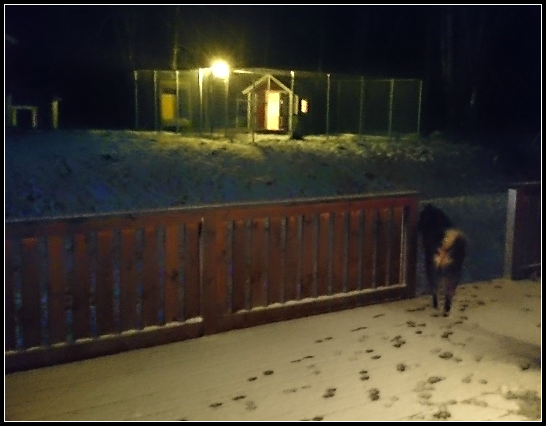 Ja som ni ser så hade det allt kommit lite snö under natten, något som Jill här storögt och lyckligt spanade in ;). Och jag måste allt hålla med henne, visst är det mysigt med snön även om vägen till jobbet idag kändes som minst dubbelt så lång när snön vräkte ner mot vindrutan men när jag hade kommit halvvägs (3 mil) så lugnade det som tur var ner sig, ja iallafall till ikväll då jag åkte på andra hållet då det denna gång blev ishalka när jag kommit halvvägs. Tycker nog att en timmas restid faktiskt räcker, behövs inte alls läggas på nästan ytterligare 15 minuter på grund av halkan men vad gör man? Inte mycket annat än lättar på vänsterfoten och försöker ”gilla läget” ;).