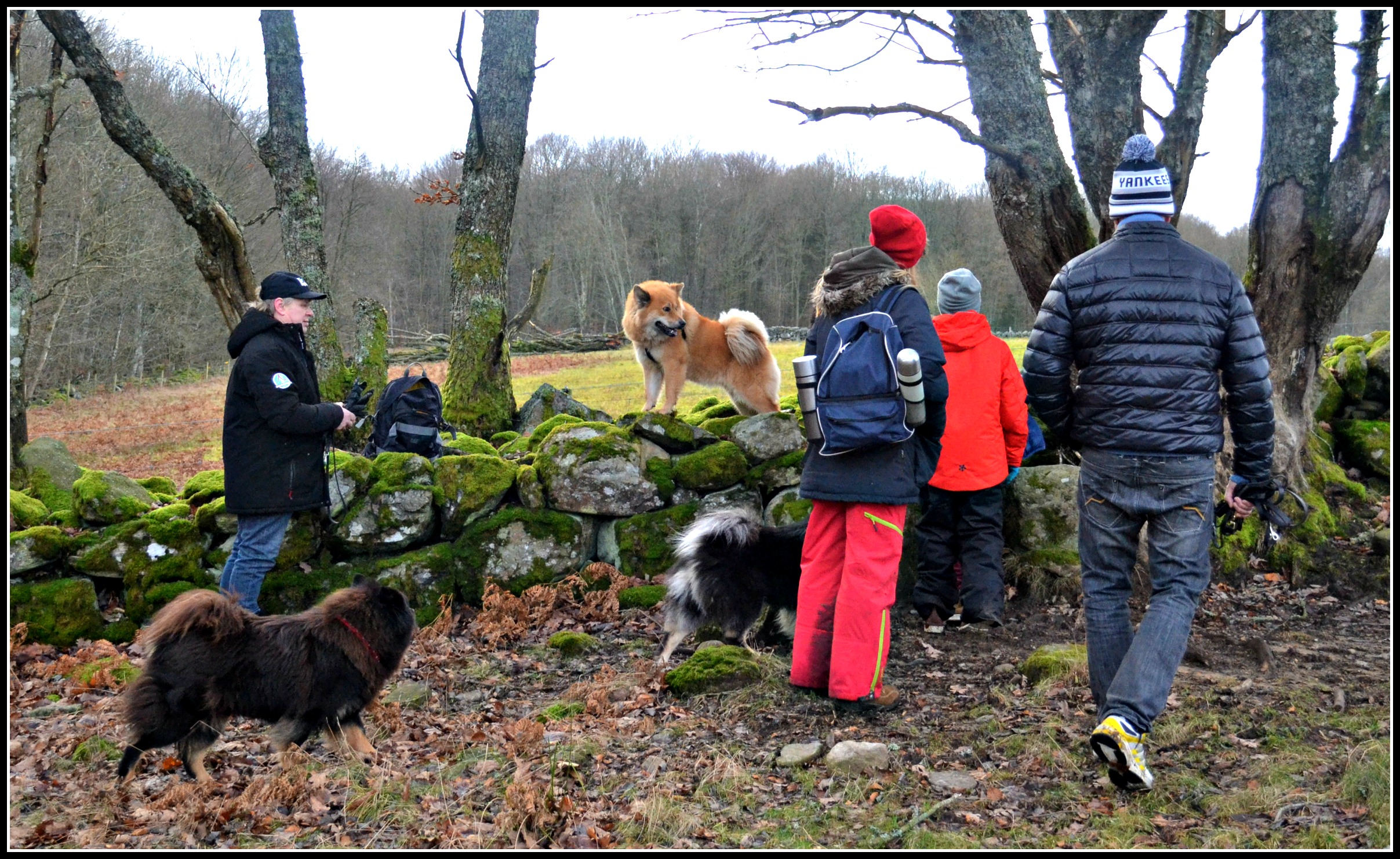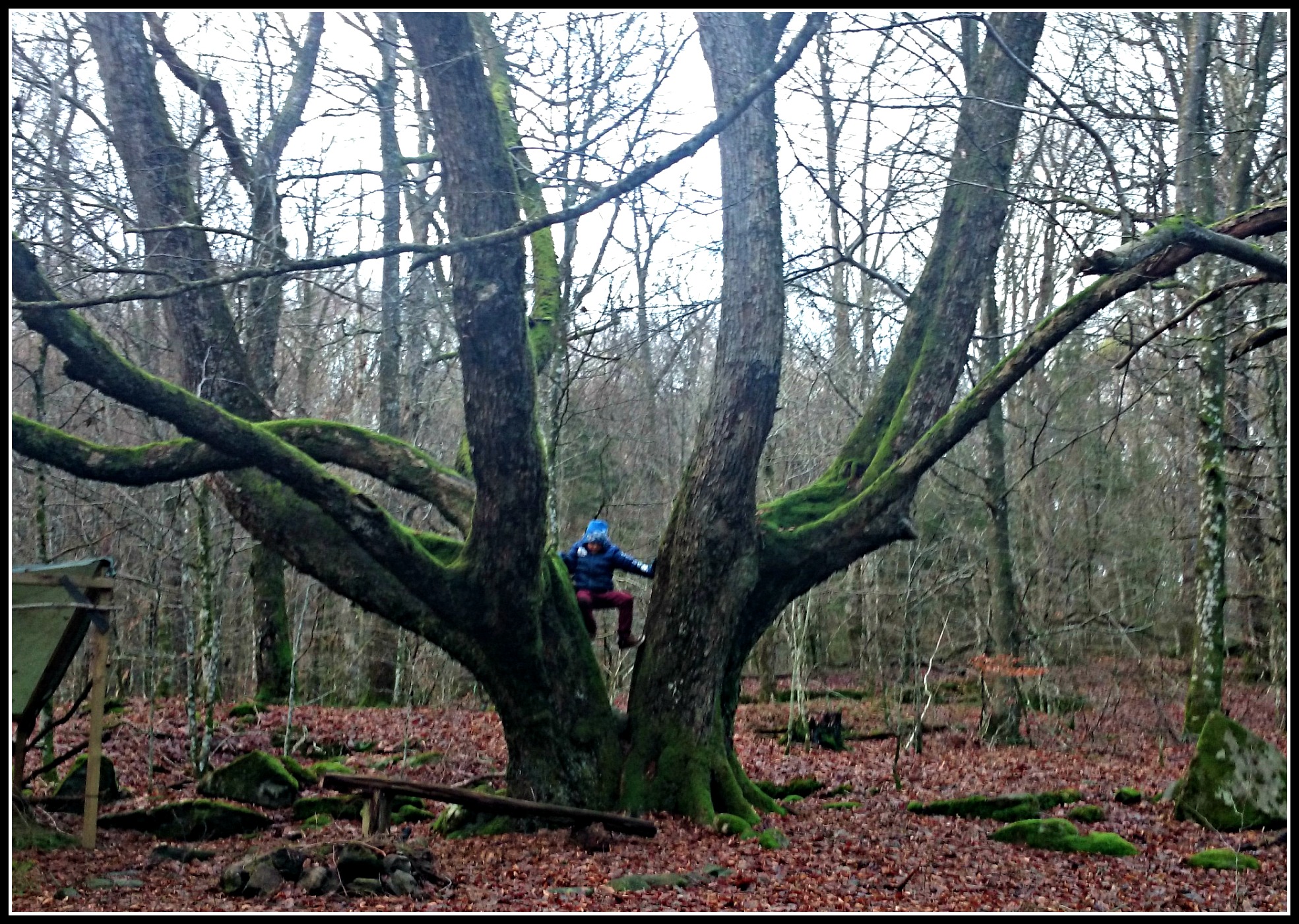 Nu tror jag säkert att hundarna inte hade haft nåt emot att släppas ihop med fåren men så roligt ska vi inte ha, kan utan problem föreställa mig resultatet ;). Så istället fick de vara kopplade de ca 3 kilometer som slingan varade och tur att detsamma inte gäller för barn för att klättra i detta häftiga träd hade inte varit lätt för Simon då 😉