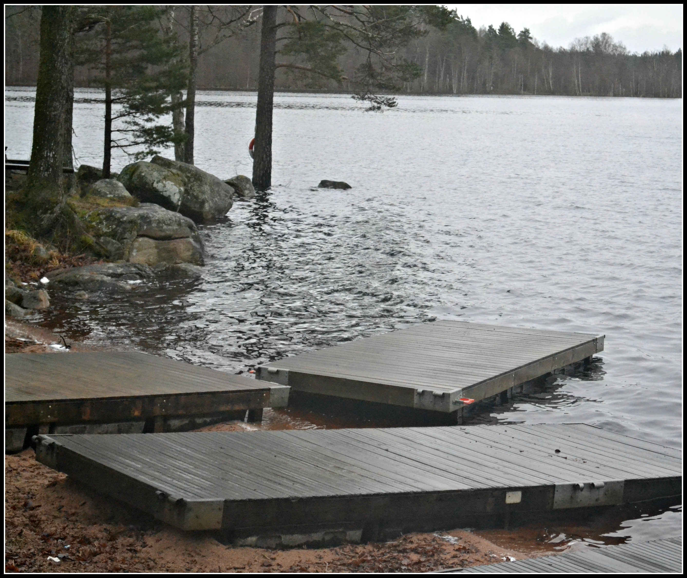 Men trots allt stök så måste ju tjejerna också få sitt och då inte i form av stök såklart utan en härlig promenad på stranden. Och det var ett riktigt skönt väder idag även om inte solen sken men vindstilla och några plusgrader är helt okej det också :). Nej som sagt, det regnade inte men sjön hade ändå stigit rejält, något som de på kommunen som plockade upp våra badbryggor bevisligen inte hade tänkt på för de är som synes snart på väg någon helt annanstans 😉