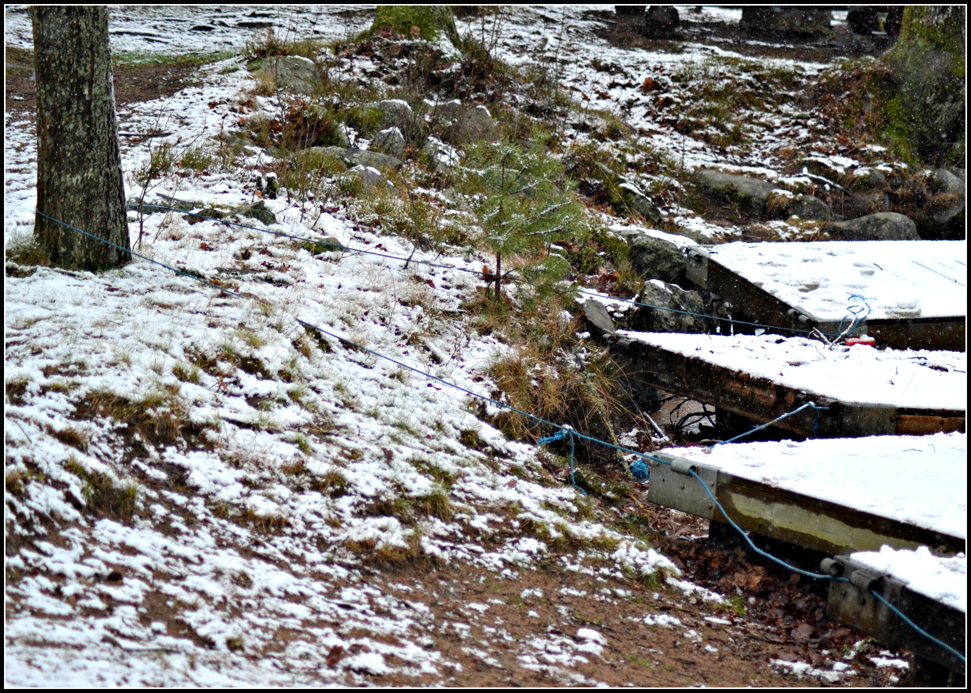 Ett tunt blått rep har använts för att binda ihop alla 6 bryggor och runt ett träd, hmm..undrar hur länge denna lösning håller? Men men… tanken är ju god iallafall 🙂