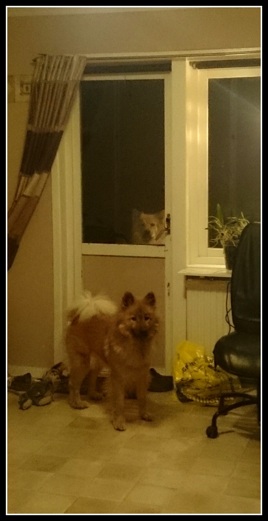 Ja exakt så här brukar Tindra visa för oss att hon vill in, inget skrapande mot dörren där inte som Jill gör utan hon använder den stirrande ”tysta metoden” ;). Något som även Zelda gör, när hon då är på utsidan alltså och inte som här på bilden 😉 , men hon varken tittar in genom fönstret eller skrapar utan står bara precis utanför dörren och väntar stoiskt på att någon vänlig själ vill släppa in henne 🙂
