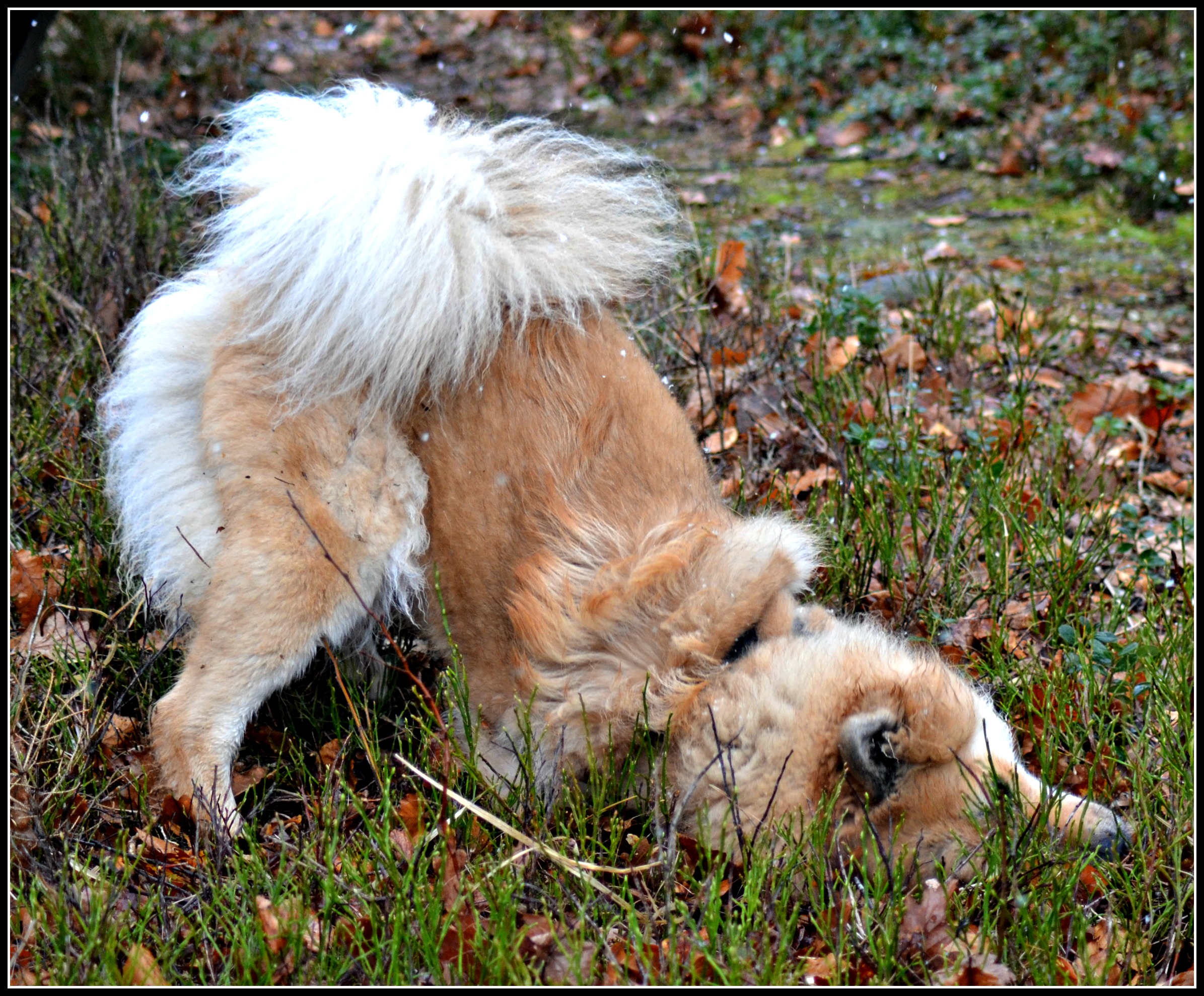 ..och Tindra nästan slog knut på sig själv i försöket att pricka in rätt ställe att rulla sig på 😉 :).