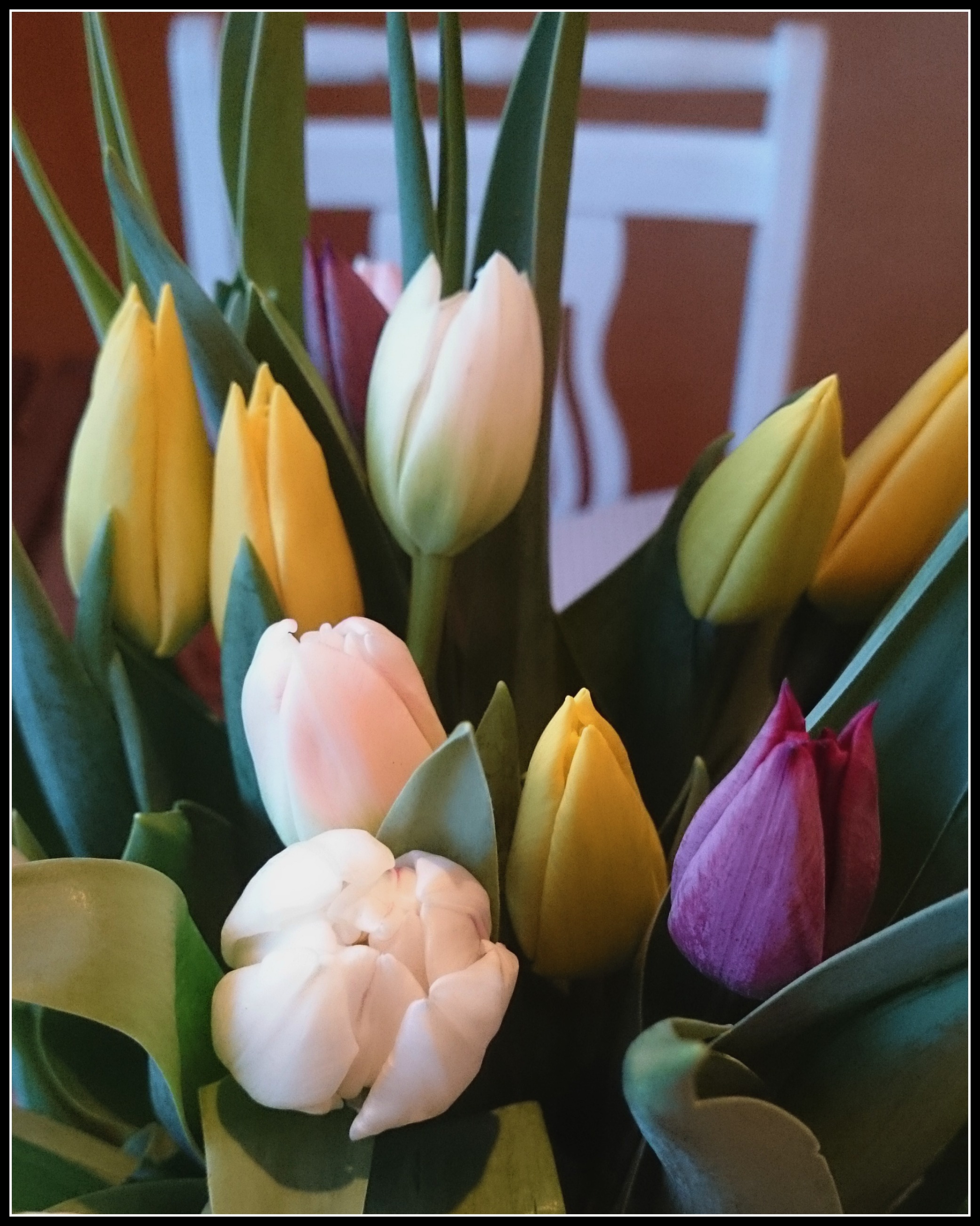..och en stor bukett tulpaner i blandade färger på köksbordet 🙂