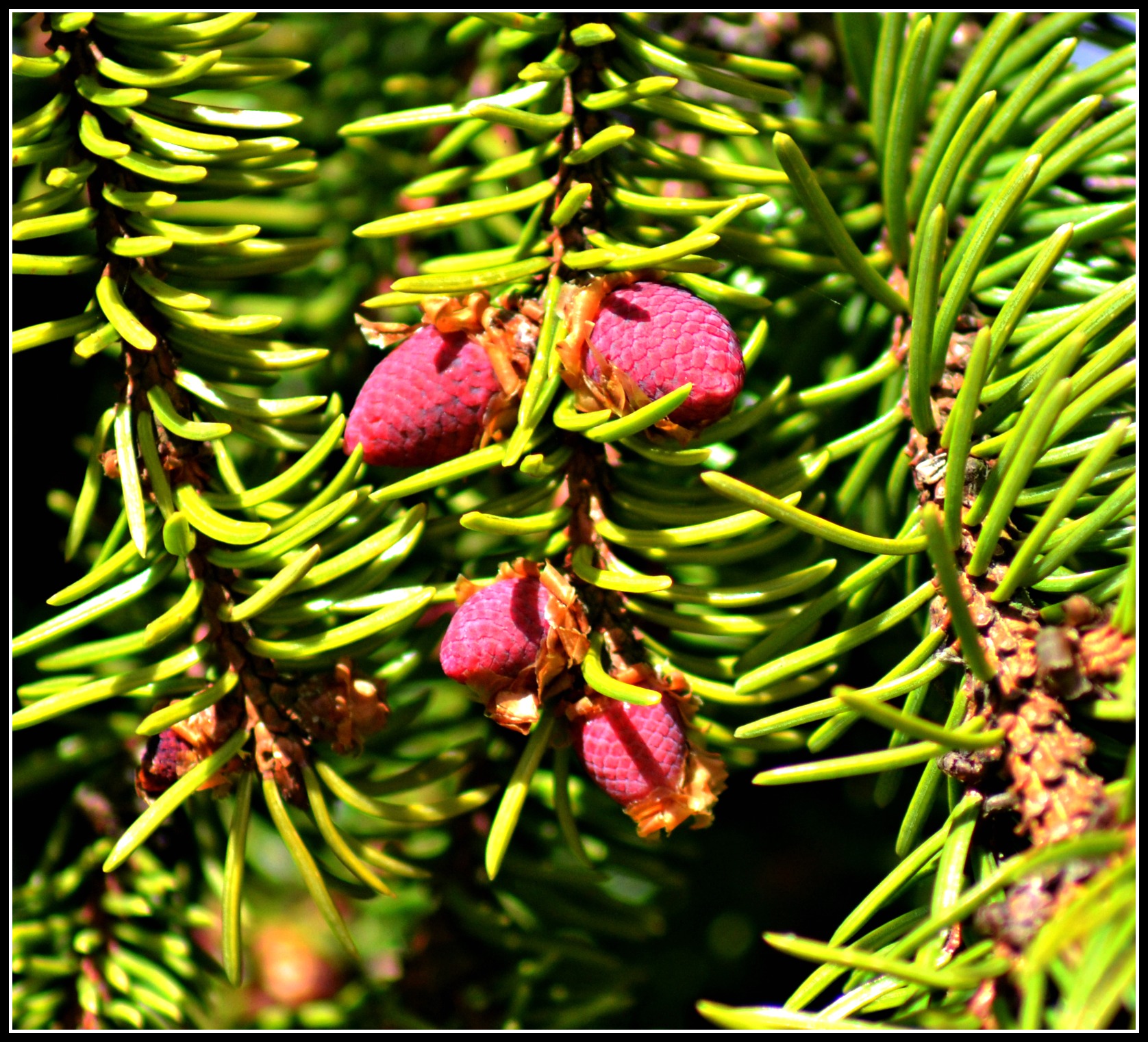 Ute på ängen där dessa foton är tagna ligger det en gran som fallit för vinden, dock är den fortfarande vid liv och har satt nya bebis-kottar som till och med är rosa!! Då måste väl det betyda att det är tjej-kottar eller? 😉