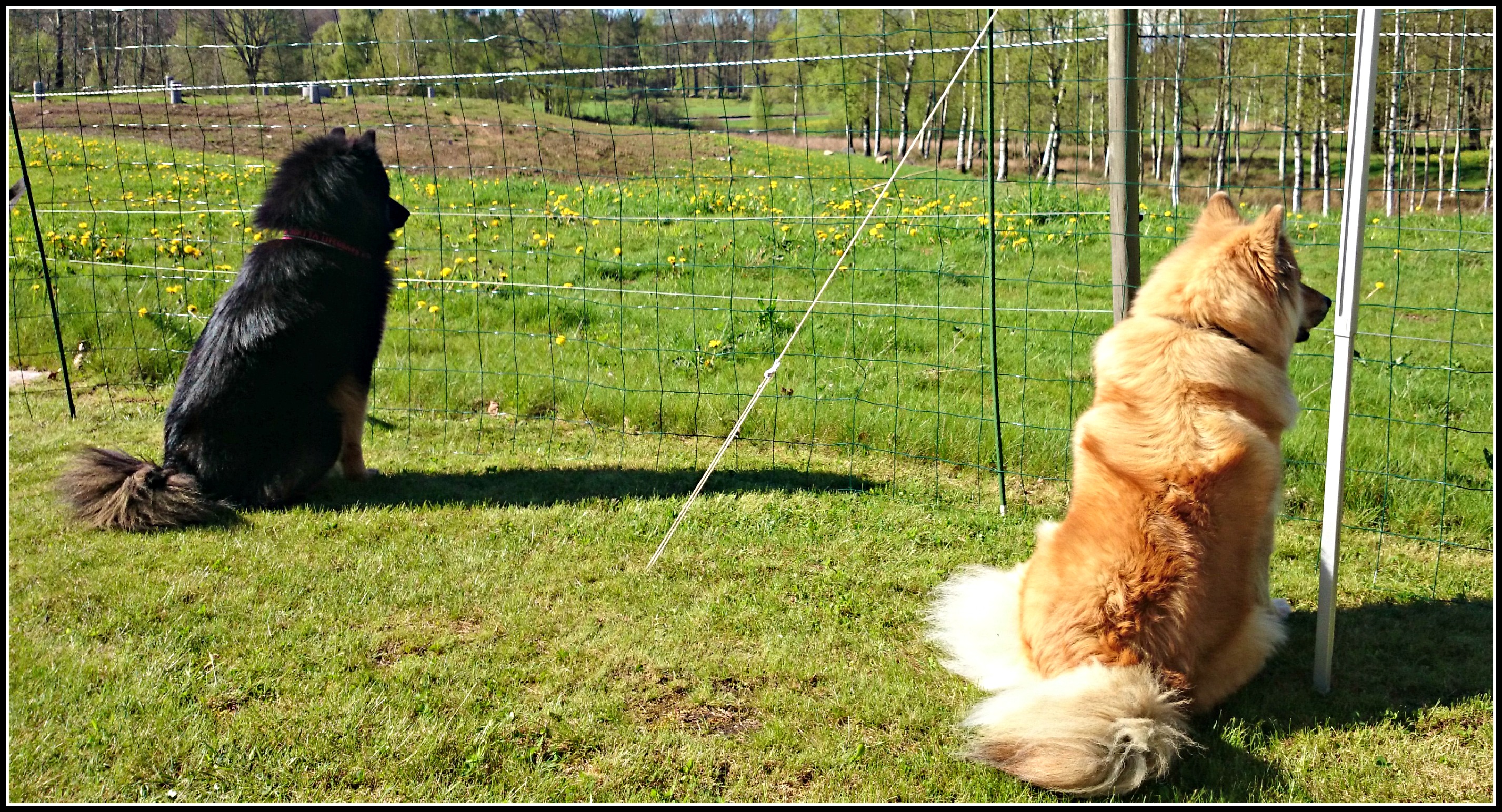 Inga som helst problem med att få plats med vagn och inhägnad alls som ni ser och tjejerna var snabba att kolla in omgivningarna, ja med andra ord hagen som gränsar till vår campingtomt. Kan ju bli jättespännande om det dyker upp ett gäng kor där..eller inte 😉