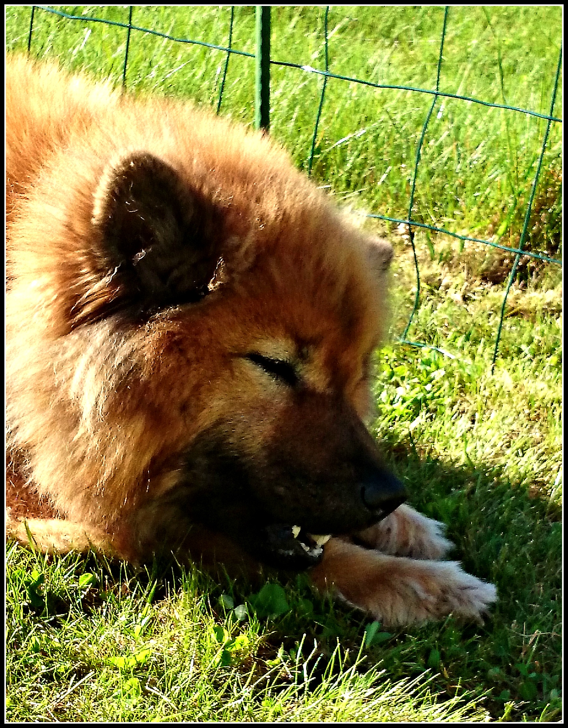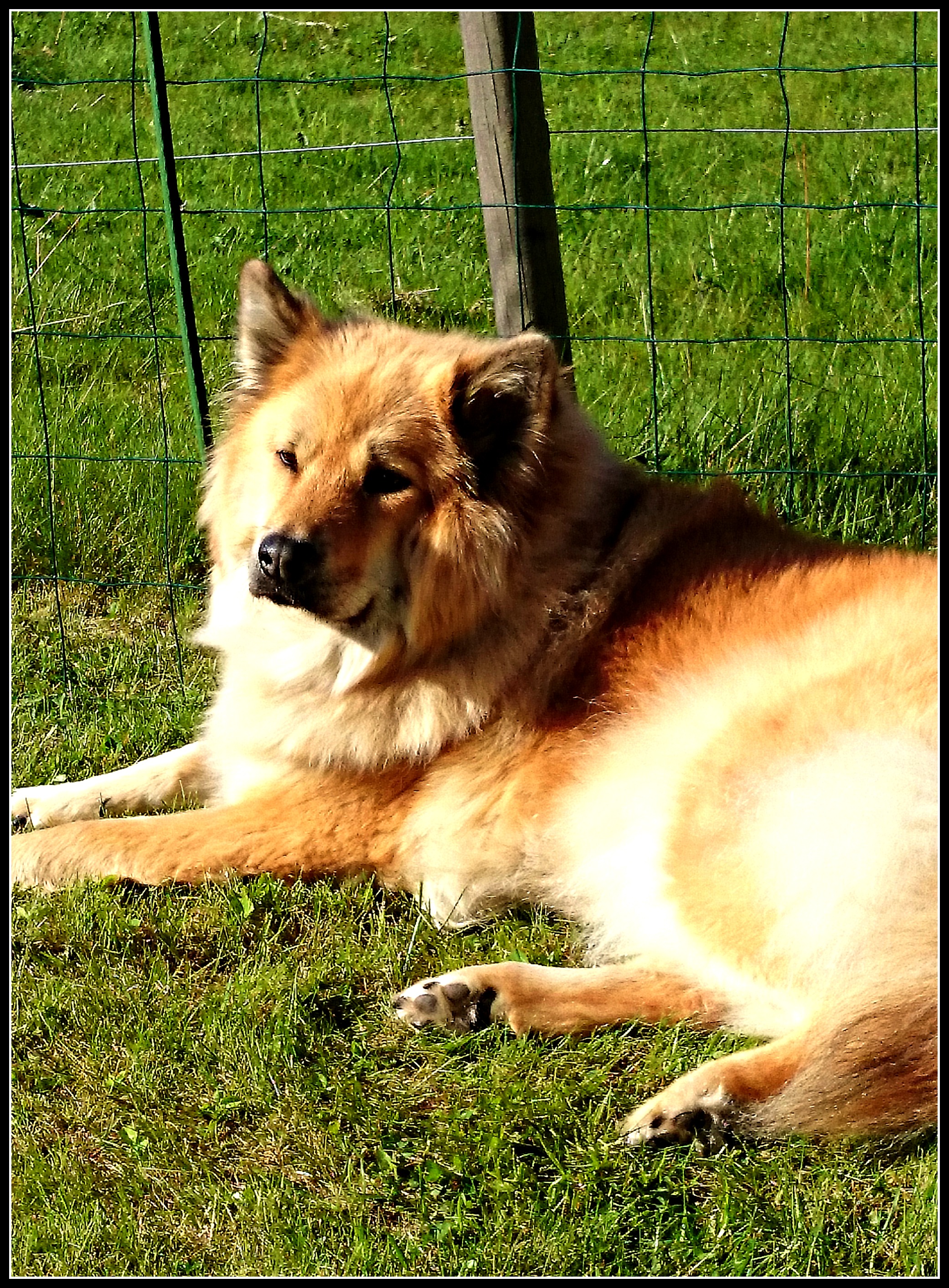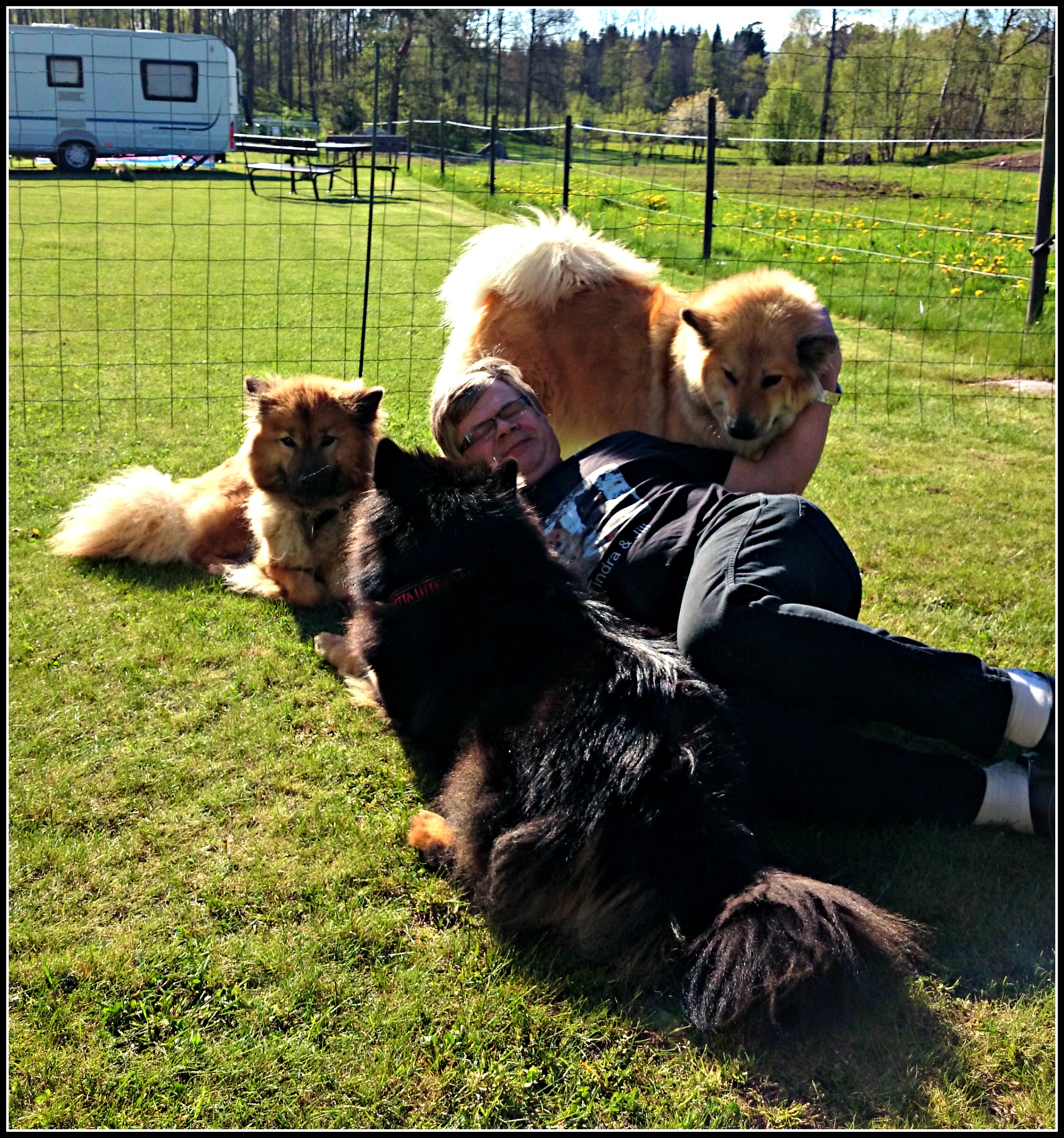 Nu sitter jag här i den underbara kvällssolen som fortfarande värmer skönt och skriver på detta inlägg med fåglarnas kvitter i öronen, inte undra på att jag njuter av tillvaron ;). Mätt i magen som jag också är efter grillade revben, färskt bröd med goa ostar och en kall en på det så kan det inte bli så mycket bättre :). Tjejerna fick dock inte smaka på det men fick en stunds mys med husse i gräset…