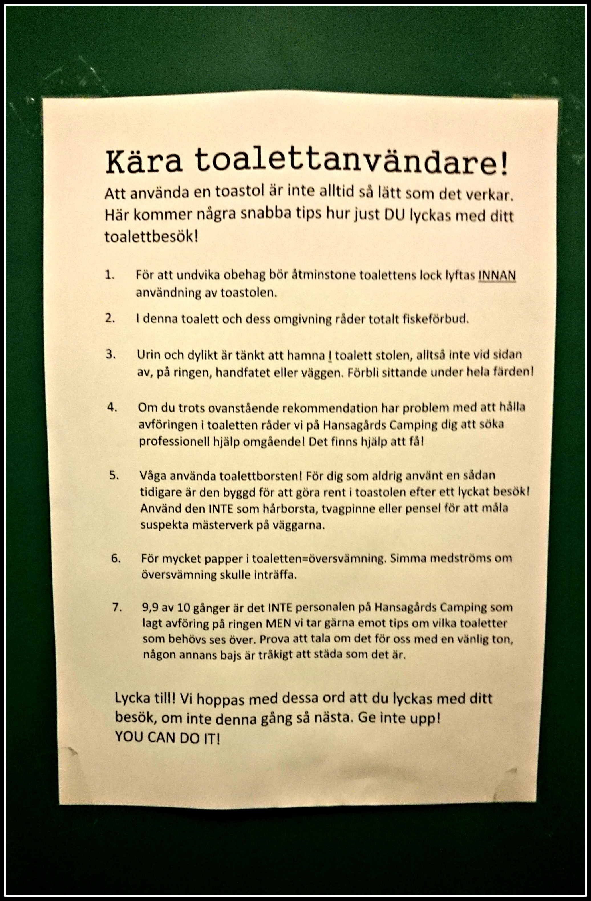 Så ätit gott har vi minsann gjort och såklart druckit detsamma. Ja det gäller ju att tänka på vätskebalansen i värmen eller? ;). Enda nackdelen dock med att ha koll på sin vätskenivå är de otaliga besöken på damernas, fast med denna lapp uppsatt i ögonnivå när man placerat sig på sitsen så blev det faktiskt en anings roligare 😉 😀