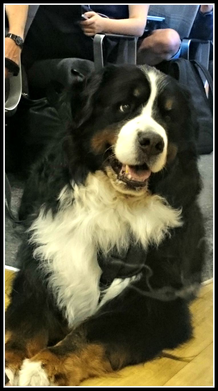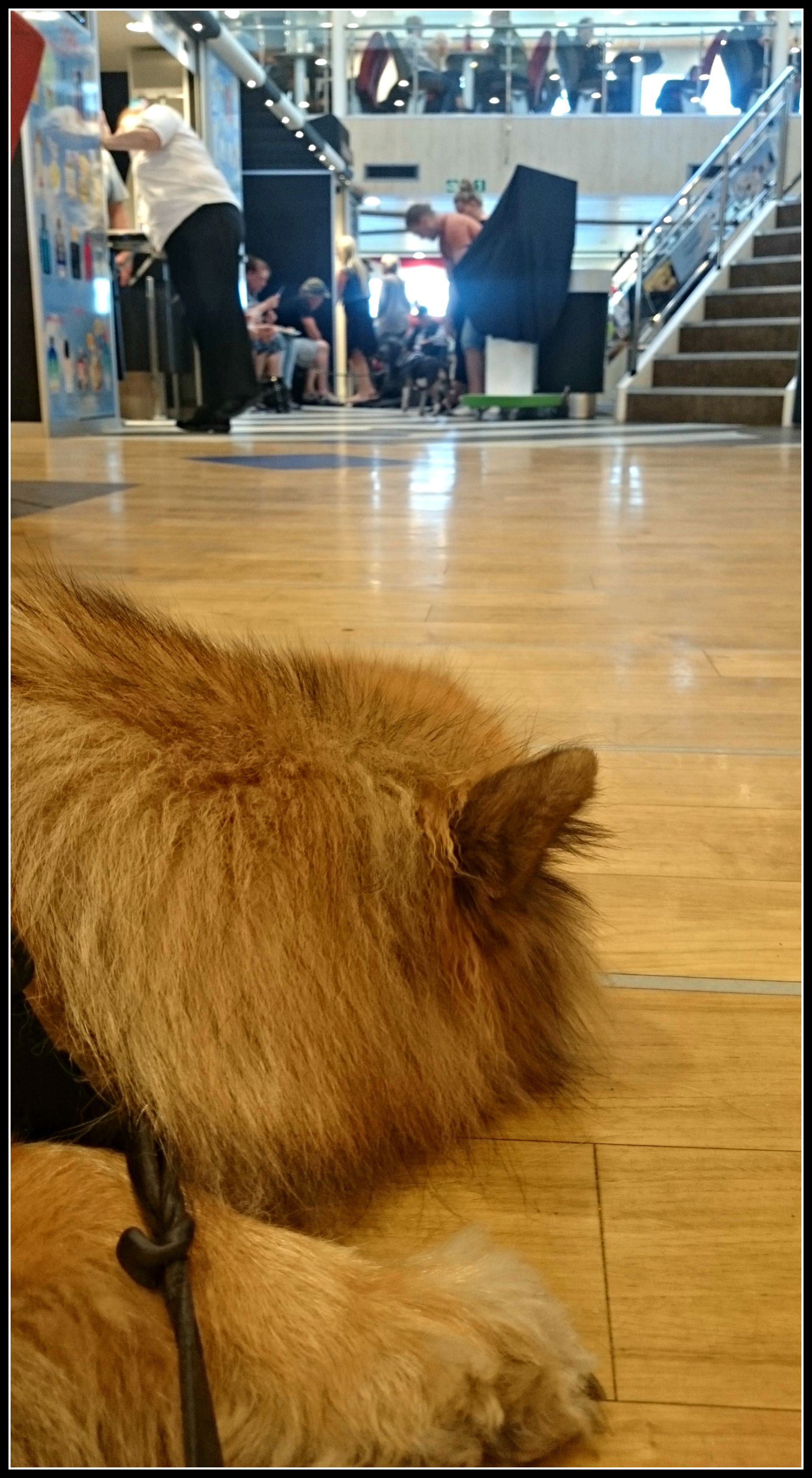 Väl på plats med bil och husvagn så var det dags att manövrera tre hundar uppför alla trappor och in på hundavdelningen och jag kan säga att hala ståltrappor inte är populärt hos fyrbenta men upp kom vi i en hiskelig fart för att sedan hitta oss en plats på golvet då alla sittplatser på hundavdelningen var upptagna. Inte så konstigt med tanke på utställningen men det funkade bra ändå på golvet eftersom färden över bara tog 1 timma och 20 minuter.