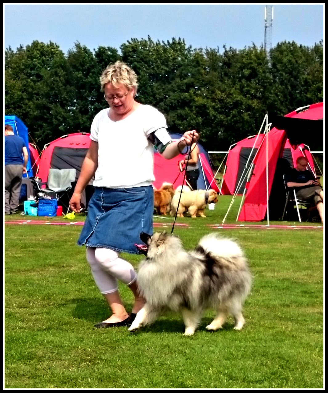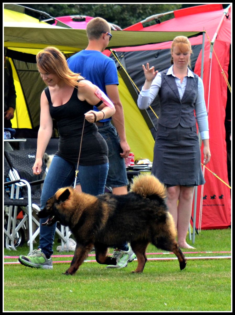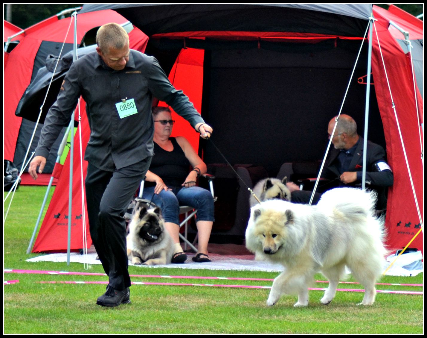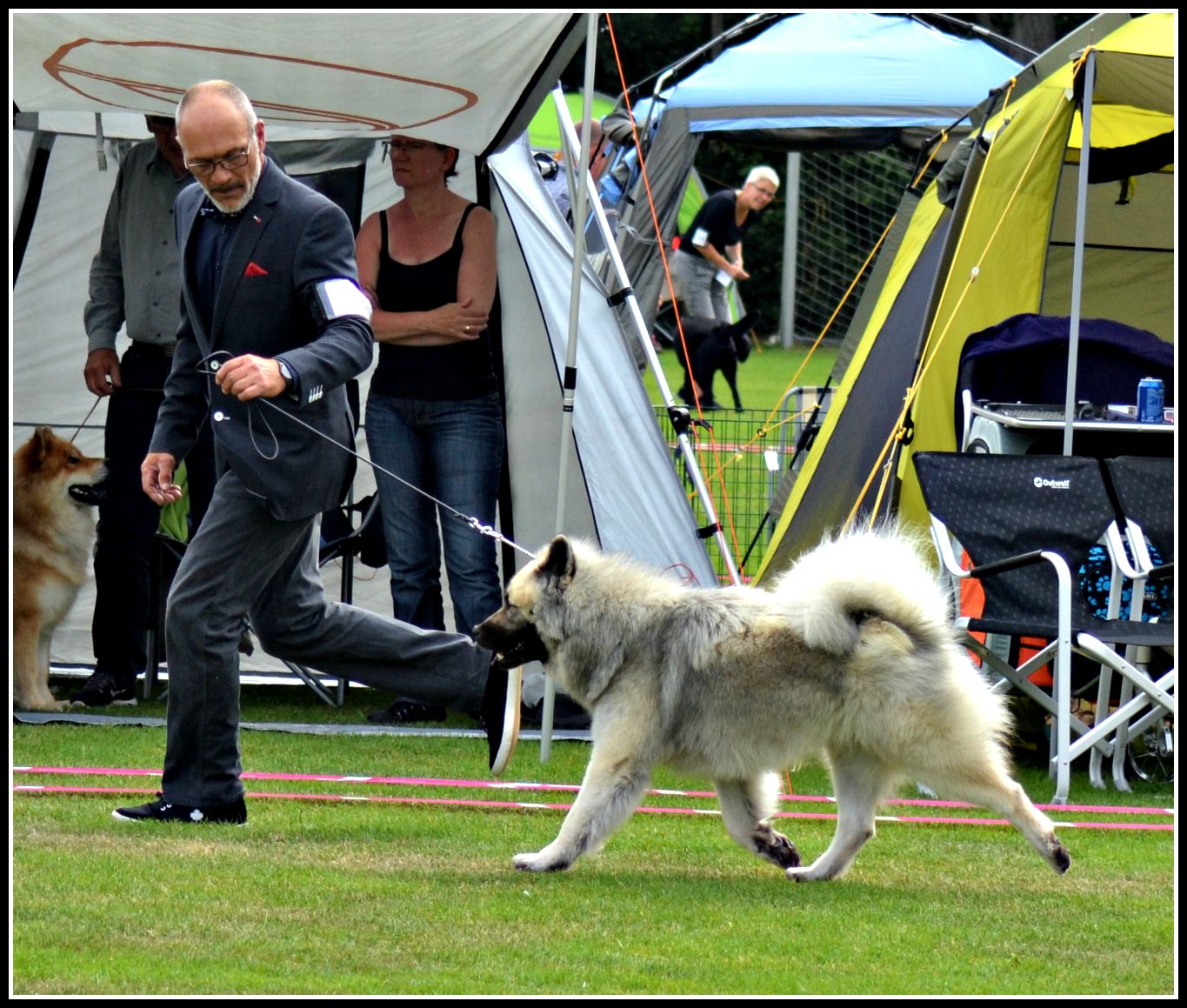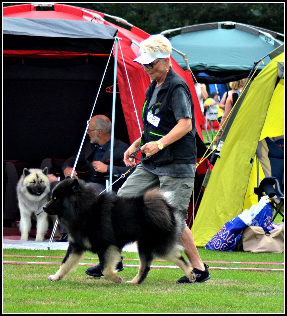 Väl tillbaka på campingen igen så möttes vi av en betydligt piggare Hasse och en betydligt lugnare Tindra :). Så på söndagen fick alla åka med till utställningen och där ställde vi både Tindra och Jill och denna dag gick det bättre med varsitt very good som resultat, något som man inte kan vara annat än nöjd med under rådande omständigheter ;). Men vad som gjorde mig allra gladast var klappen på axeln av domaren Ole Staunskjær och hans ord; ”Du har en kanonhund där, bara läs min kritik så får du se. Jag önskar bara lite mer päls”. Så han ska vi definitivt ställa för igen då Tindra är sig lik igen ;). Och här kommer en bild på oss i ringen, tagna av Charli Ahl Ludvigsson, tack snälla du ❤
