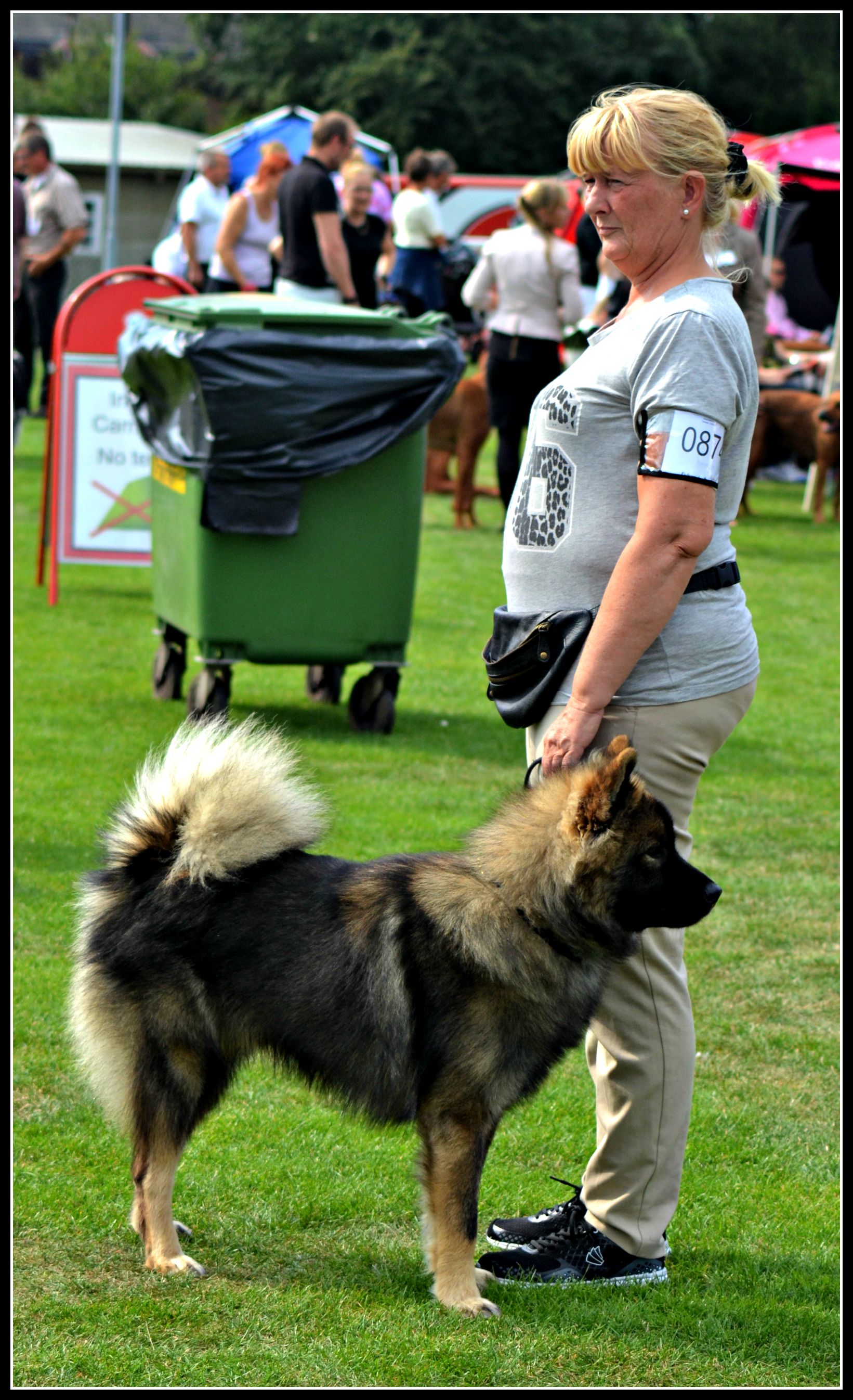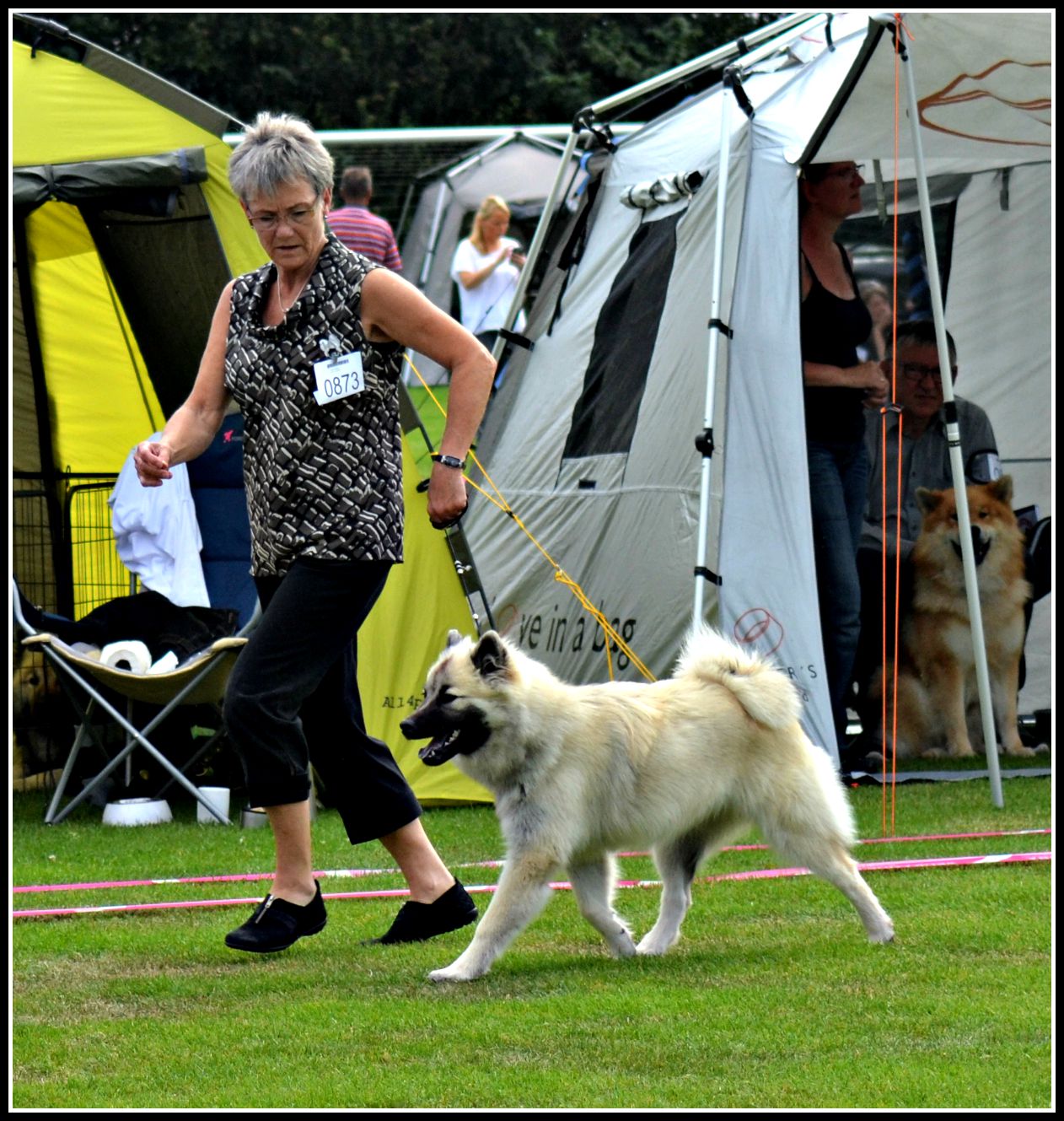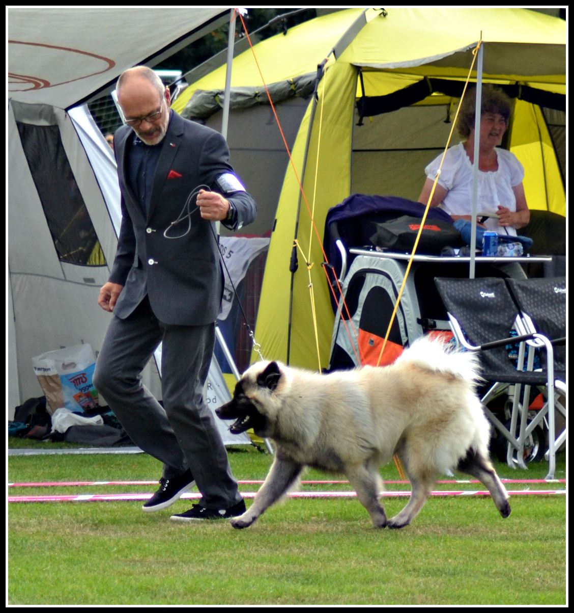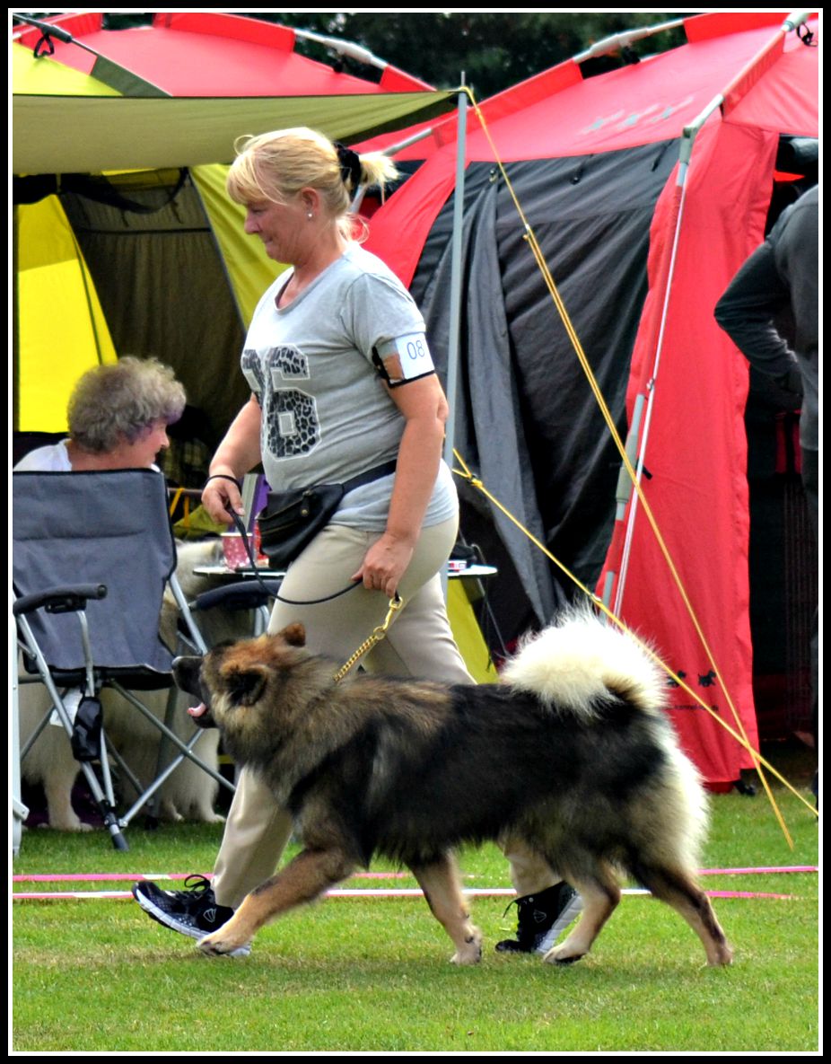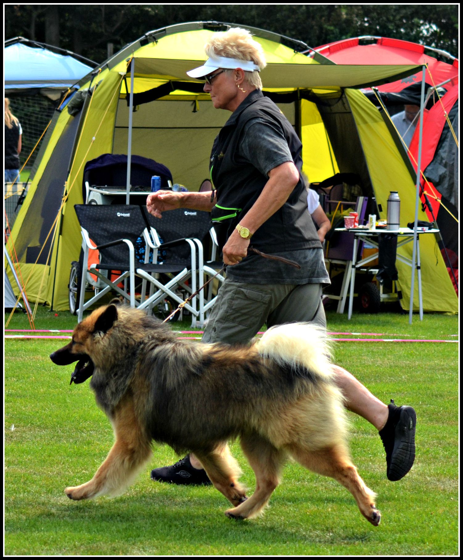 Väl tillbaka på campingen igen så möttes vi av en betydligt piggare Hasse och en betydligt lugnare Tindra :). Så på söndagen fick alla åka med till utställningen och där ställde vi både Tindra och Jill och denna dag gick det bättre med varsitt very good som resultat, något som man inte kan vara annat än nöjd med under rådande omständigheter ;). Men vad som gjorde mig allra gladast var klappen på axeln av domaren Ole Staunskjær och hans ord; ”Du har en kanonhund där, bara läs min kritik så får du se. Jag önskar bara lite mer päls”. Så han ska vi definitivt ställa för igen då Tindra är sig lik igen ;). Och här kommer en bild på oss i ringen, tagna av Charli Ahl Ludvigsson, tack snälla du ❤