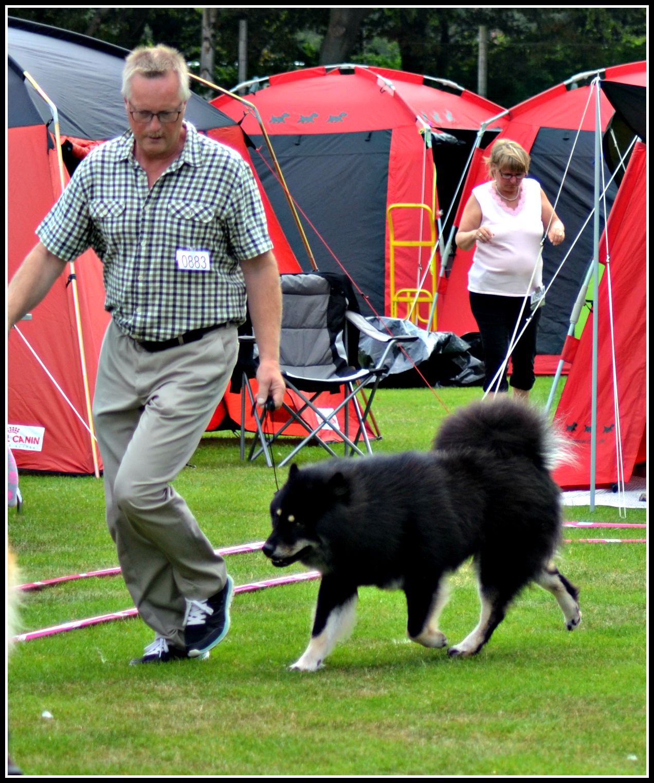 Som jag slutade med i förra inlägget så startade inte lördagen speciellt bra med Hasse som hade haft en jobbig natt då han troligtvis blev matförgiftad 😦 och inte mycket bättre var det med Tindra som fortfarande var lite skärrad efter fredagskvällens fyrverkerier. Och med tanke på detta så beslutade vi att både Zelda & Tindra fick vara hemma med Hasse i husvagnen medan jag åkte med Jill till lördagens utställning. Inte optimalt men vad gör man? Hälsan hos både två- och fyrbenta går ju före allt annat såklart! Zelda var ju inte dålig men eftersom hon är totalt ur päls och tappat en del i vikt efter anaplasman så kändes det inte alls okej att visa upp henne i championringen tillsammans med de andra tikar som var i mycket fin kondition :). Så jag tog Jill med mig och åkte tillsammans med Siv & Roger till utställningen och där vid ring 19 snyltade jag hela dagen i deras tält och det behövdes verkligen för jisses så varmt det blev ;).