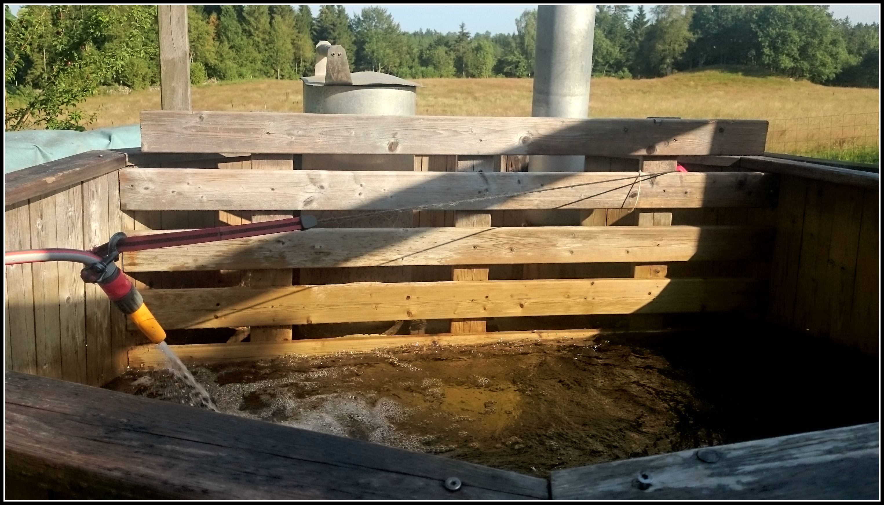 Så idag har det pysslats här hemma med allt från att gå med röjsåg, skura staket till att försöka fylla badtunnan, vilket inte visade sig vara så enkelt då den har torkat isär en hel del i värmen. Vi hade fyllt den nästan till hälften men det var tydligen inte nog för det droppar rejält ifrån den nu men vi hoppas det ska minska, annars får vi fylla på den på nytt imorgon ;). Och på tal om att fylla på vatten, Hasse kom på ett helt nytt användningsområde för ett flexi-koppel 😀