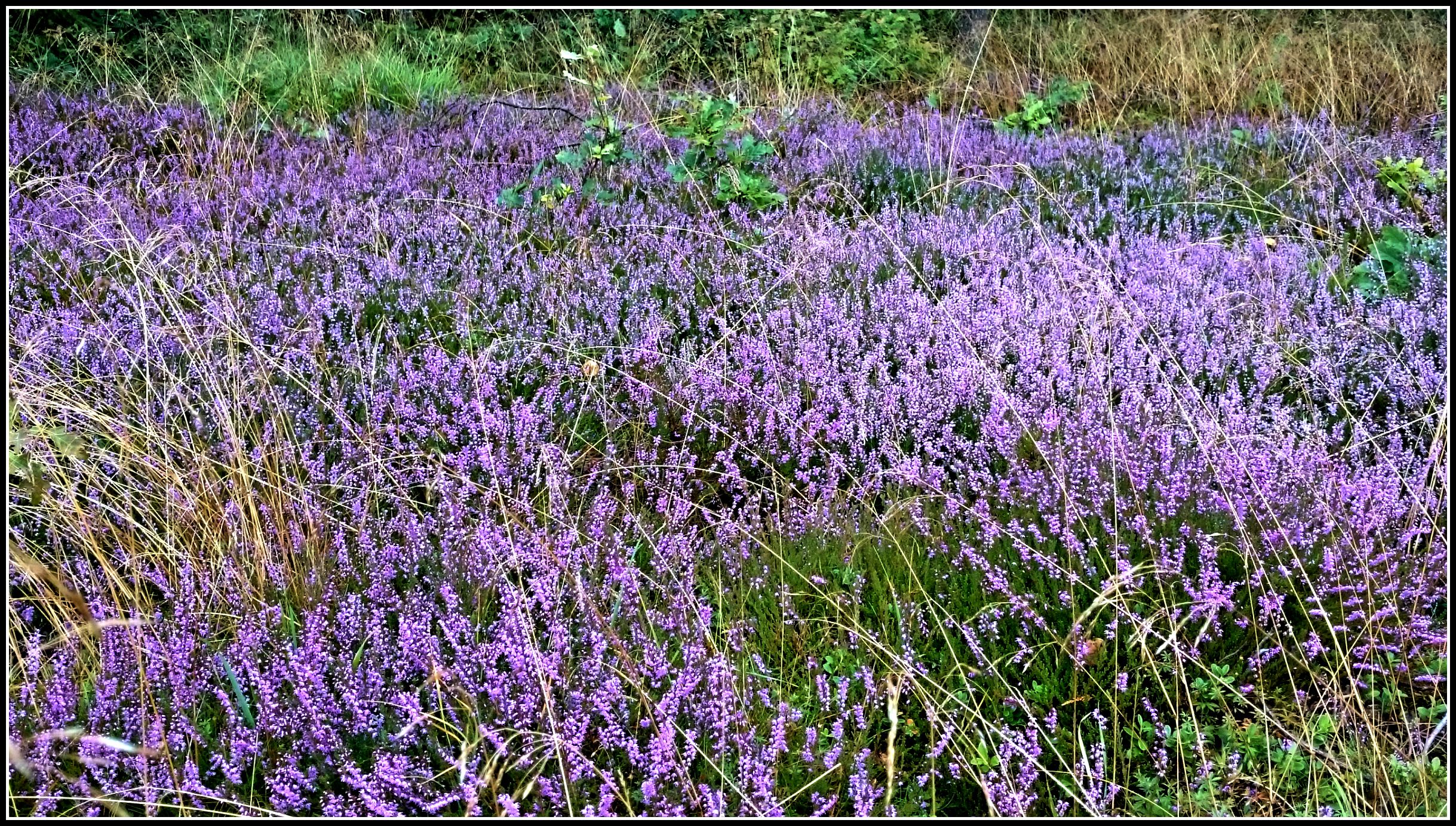 Inte direkt mina favoriter, tycker att de ser en anings lömska ut, är stora samt det faktum att det bara är en tunn stållina emellan oss.. ;). Så inte blev promenadtakten lugnare här precis, snarare tvärtom 😉 , men jag hann ändå se denna härliga ljung-matta vid sidan av vägen 🙂