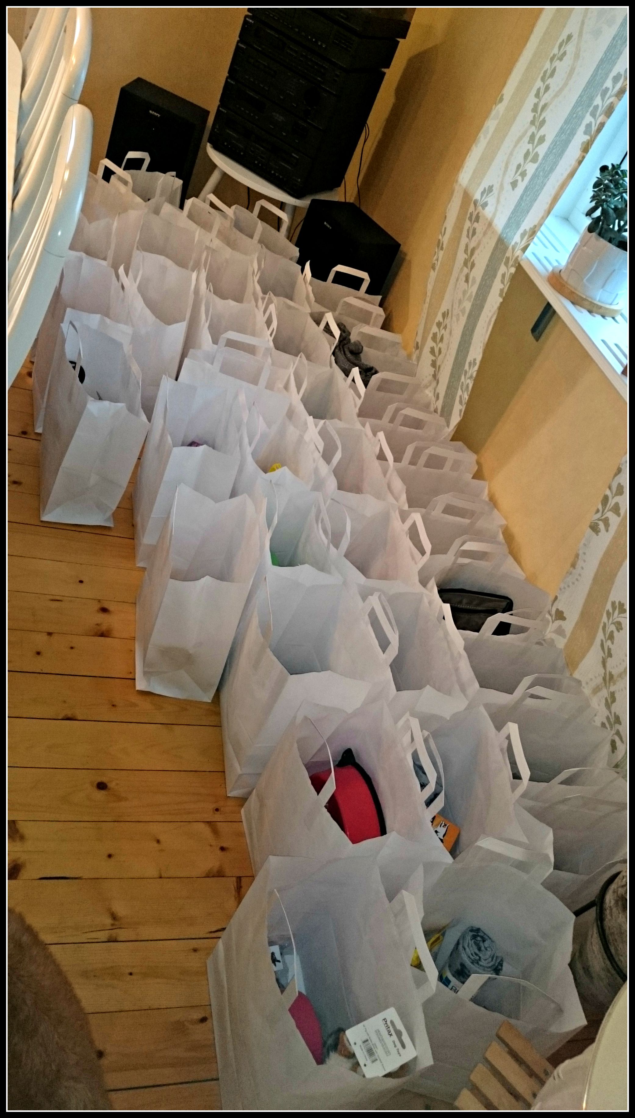 En härligt blöt uppfriskande promenad blev det ändå, tack Carina & Livia för sällskapet :). Och med rastade tjejer som kurade ihop sig i soffhörnet när vi kom hem kunde jag med gott samvete sticka till Gekås för att handla det sista till helgens ”goodie-bags”. Som tur var så ställde goa kompisen Anette upp och åkte med som smakråd och hjälp, tack igen vännen ❤ , och som resultat står här nu 38 stycken påsar som väntar på sina nya ägare till helgen :).