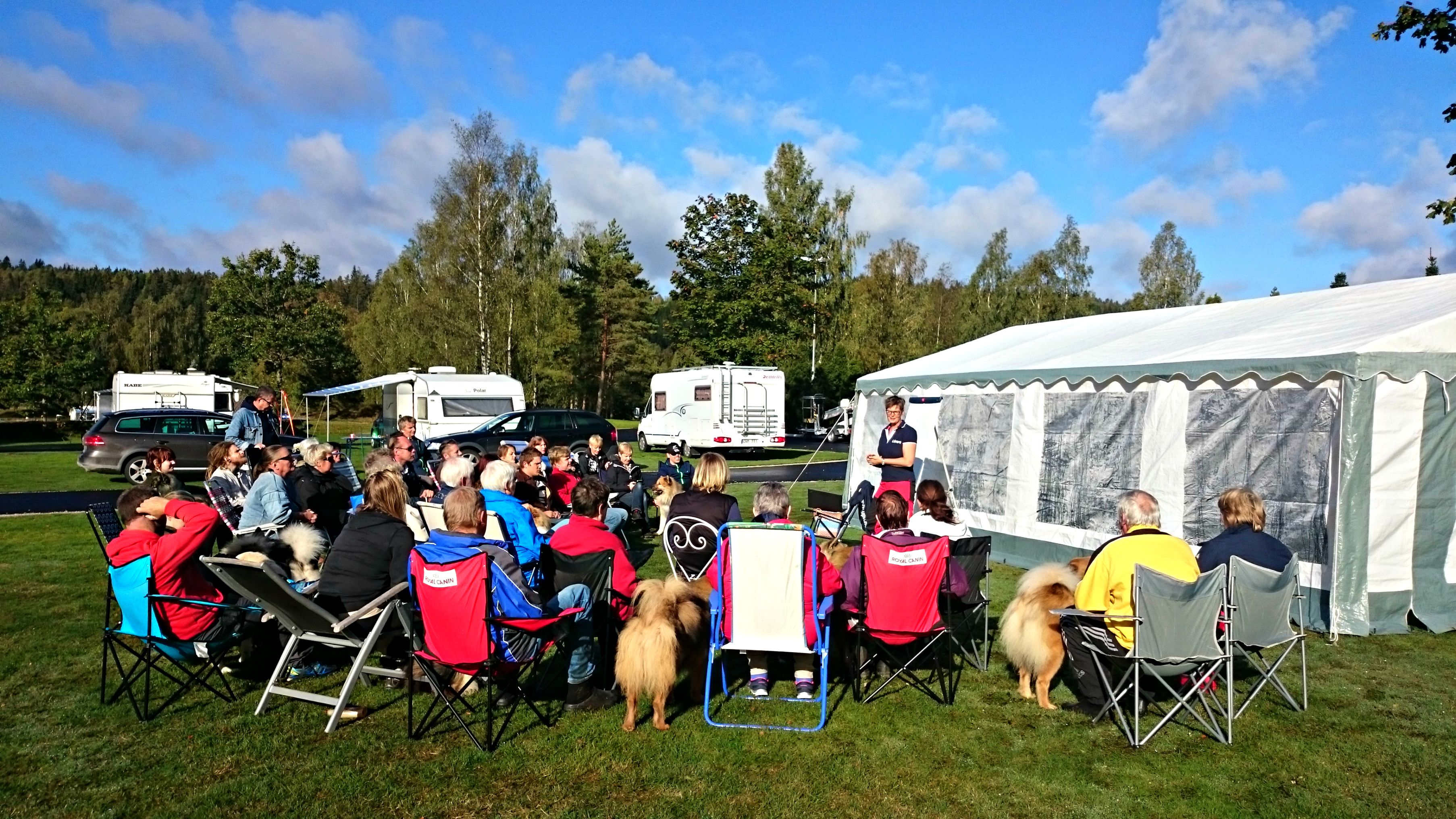 En morgonsol mot en klarblå himmel, ja jag menar det! Hittills har inte vädret svikit oss på någon träff innan och så blev det inte denna gången heller 😉 :D. Frukost stod allra först på schemat men vid 10-tiden satte veterinär Lotta Olsson igång sin föreläsning om vaccinering och den var välbesökt som ni ser 🙂